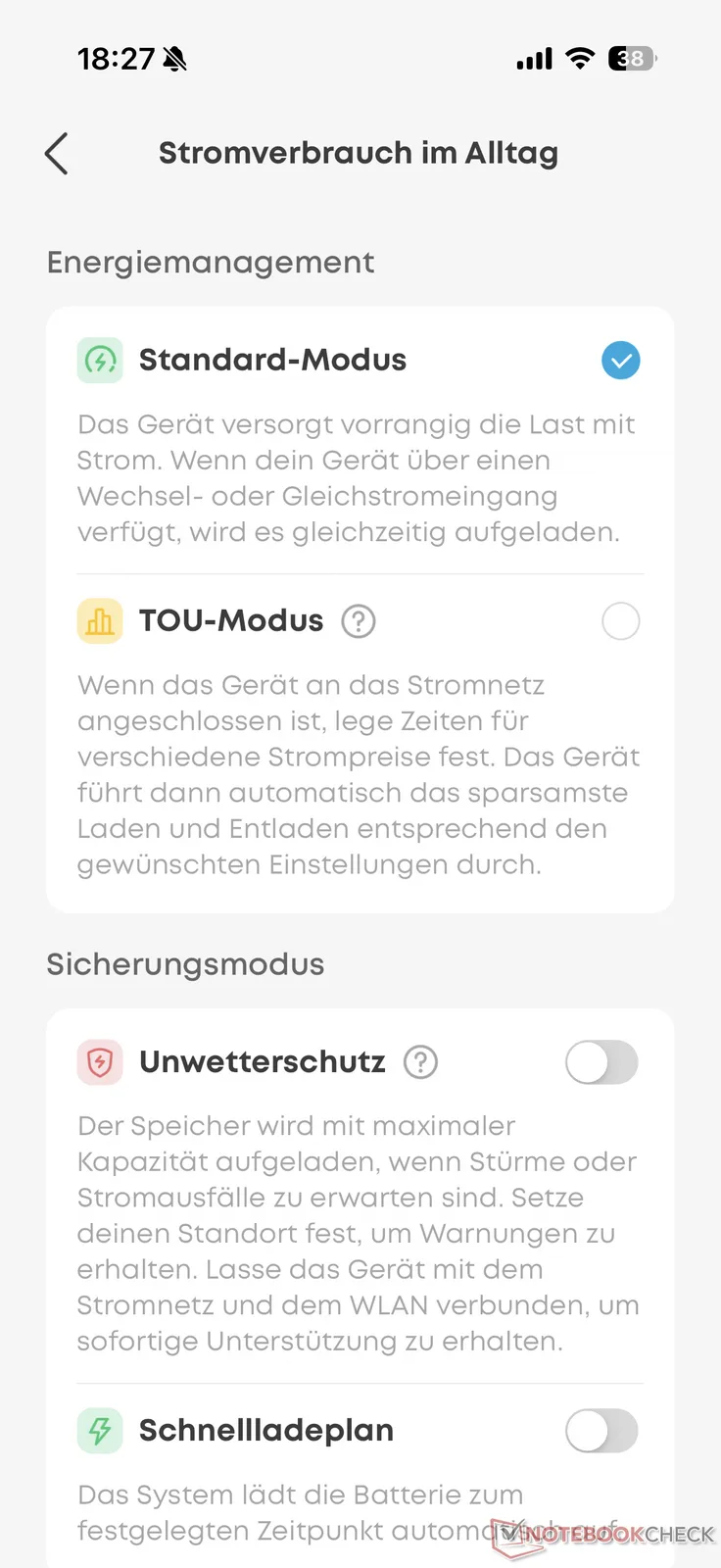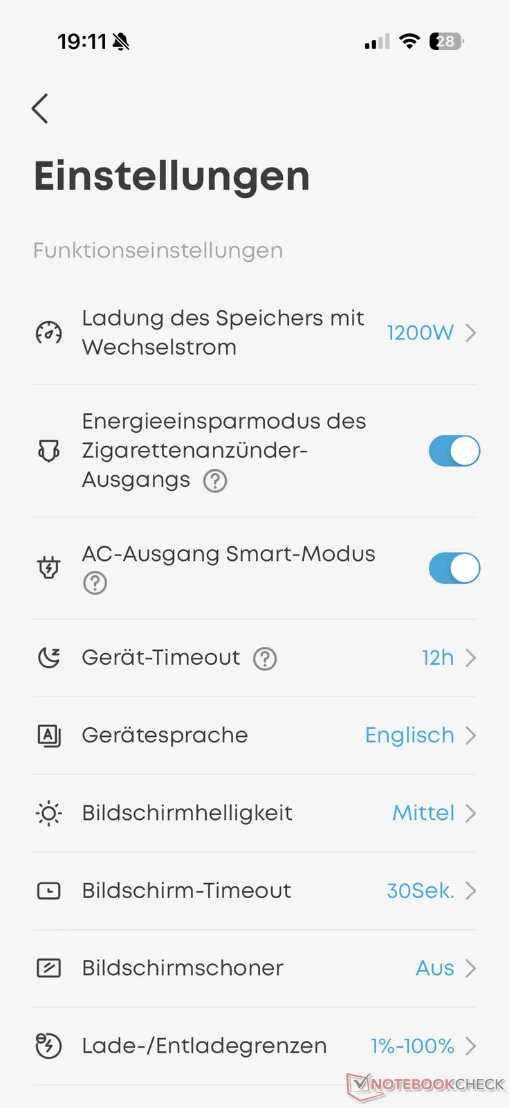 O aplicativo também fornece informações como o nível de carga da bateria e o tempo de uso restante com a potência de saída atual, bem como a temperatura das células da bateria. Várias configurações podem ser feitas no menu para velocidade máxima de carga, economia de energia, limites de carga e descarga e todos os aspectos da tela. As atualizações de firmware também são possíveis aqui.
