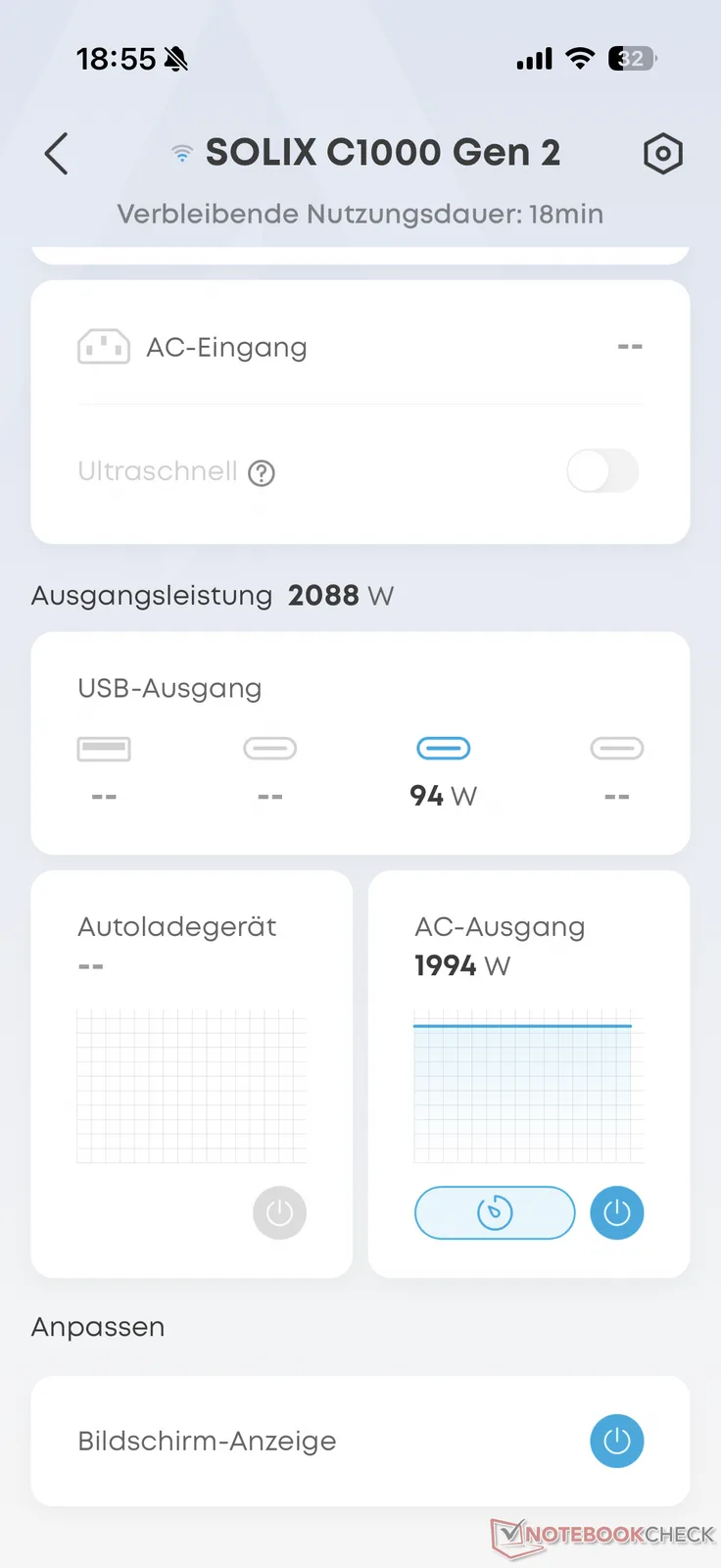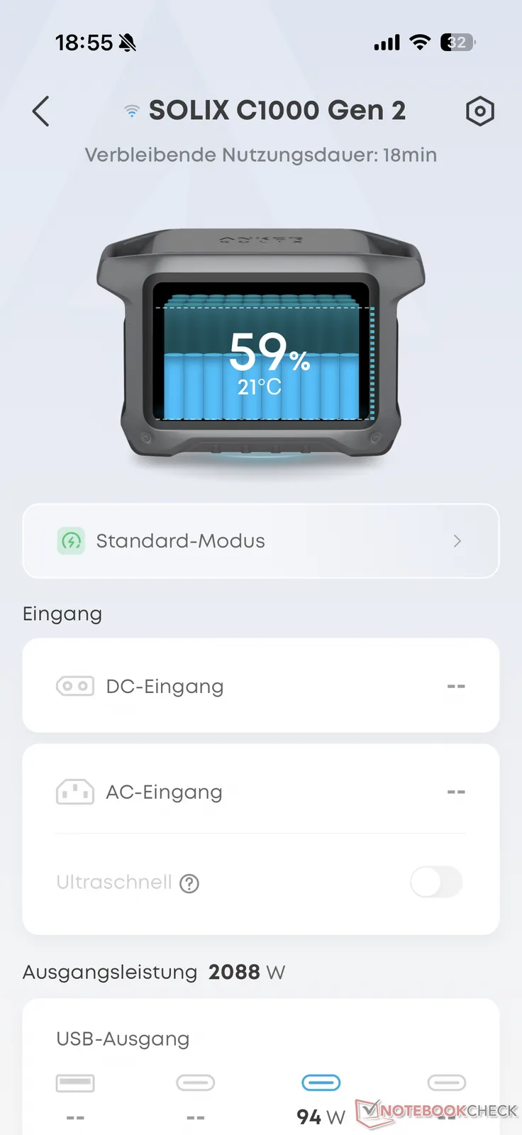 Não chegamos a atingir o tempo de carregamento de 49 minutos especificado pelo fabricante para o carregamento CA ao testar o Anker Solix C1000 Gen 2 - pelo menos não sem o modo de carregamento super-rápido, que pode ser ativado por meio do aplicativo. No entanto, com pouco menos de 55 minutos, ele permaneceu bem abaixo do limite de uma hora mesmo sem o Boost e, portanto, carrega particularmente rápido. Foi possível notar que a potência de carregamento ainda estava em torno de 1.200 W, mesmo pouco antes do final. É nesse ponto que outras estações de energia geralmente diminuem consideravelmente a velocidade.