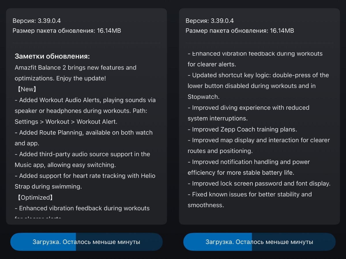 A versão de firmware 3.39.0.4 também traz várias melhorias para os usuários do Amazfit Balance 2. Elas incluem otimizações para vibrações durante o exercício, interferência do sistema ao mergulhar e a experiência do plano de treinamento Zepp Coach. Também há melhorias na exibição do mapa com informações adicionais sobre a rota, e a duração da bateria está mais estável. O senhor pode encontrar o registro completo de alterações na imagem abaixo.