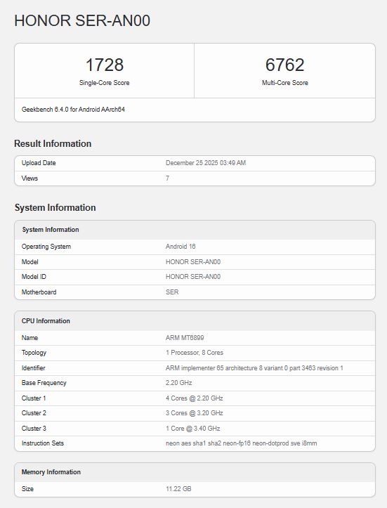 O dispositivo testado está listado com o identificador "Honor SER-AN00" e está equipado com 12 GB de RAM. Em termos de desempenho, o Dimensity 8500 não parece superar significativamente o Dimensity 8400. O chipset apresenta uma pontuação de núcleo único de 1.728 em sua melhor execução e uma pontuação de múltiplos núcleos de 6.762. Comparativamente, o Dimensity 8400 apresenta pontuações médias de 1.621 e 6.208 nesses mesmos testes.