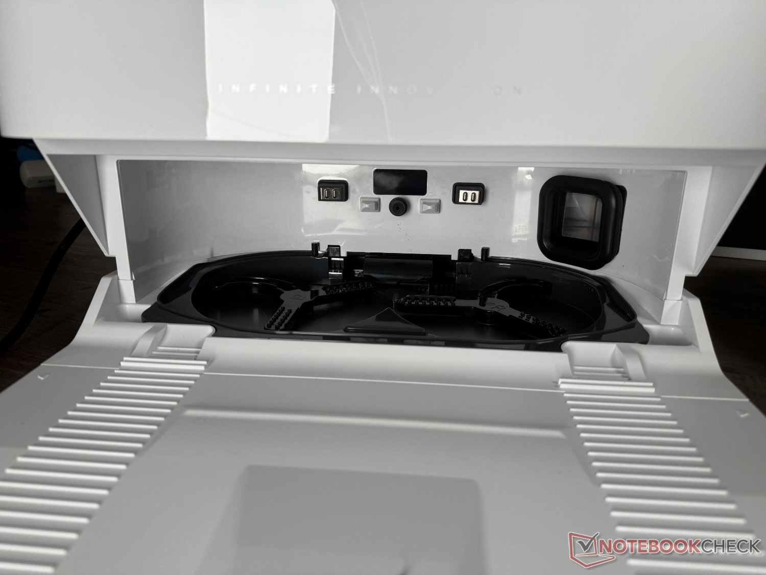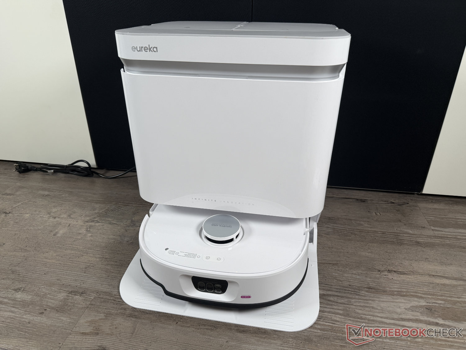 O Eureka J15 Max Ultra é fornecido com uma estação de autolimpeza. Além disso - com exceção da falta de dispensa automática de detergente - os esfregões são limpos como de costume com água aquecida a 80°C e depois secos com ar aquecido a 55°C. Visualmente, a base tem um design bastante simples e atraente. O que prejudica um pouco o visual, a nosso ver, é que a versão branca tem um cabo de alimentação preto.