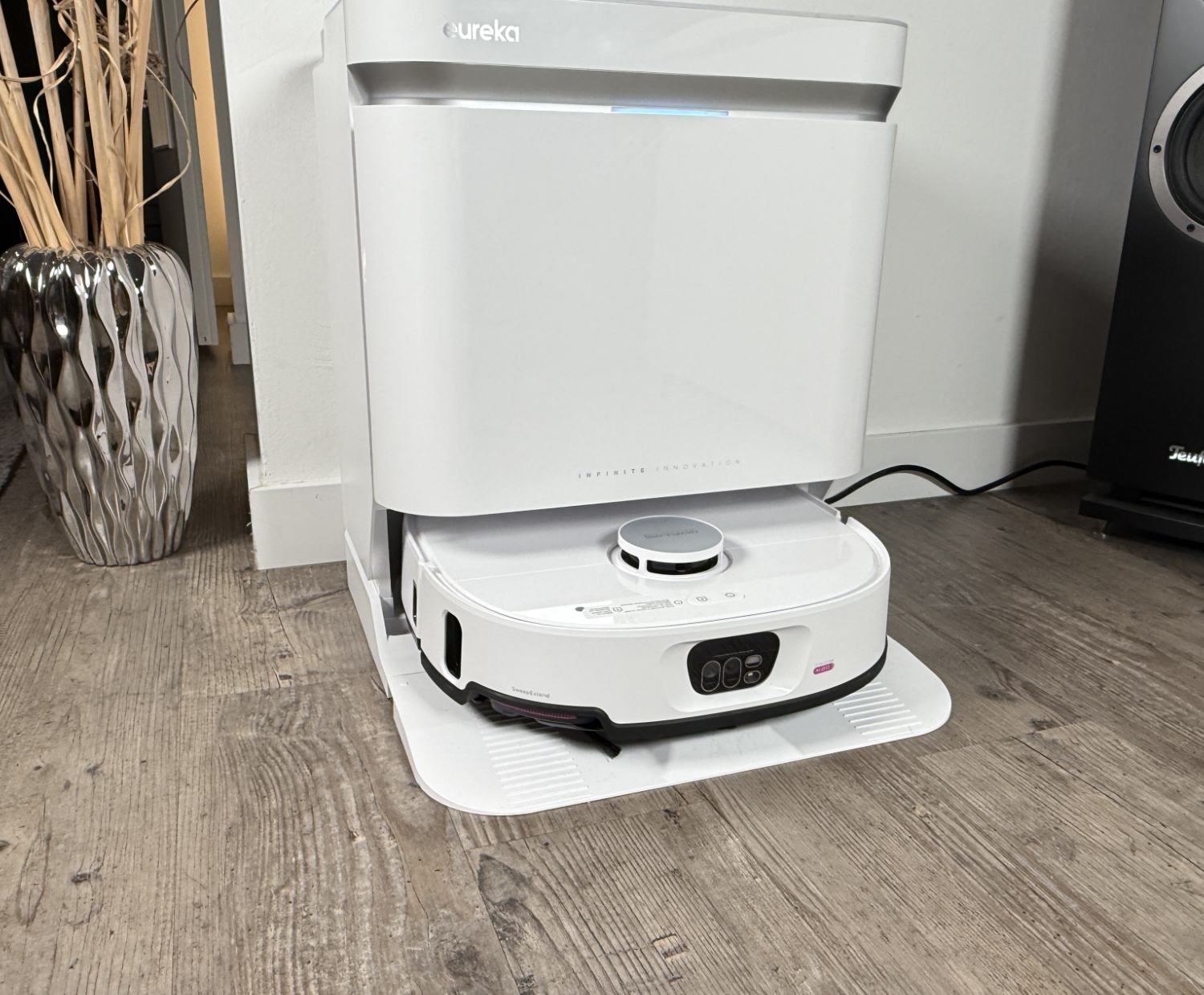 Graças à escova lateral extensível, que aqui se parece com uma garra com três dedos, e ao esfregão que se estende para fora da lateral da carcaça, a Eureka promete limpeza até nos cantos e ao longo das bordas. Ele navega com o chamado IntelliView AI 2.0, que também é usado para detecção de obstáculos e consiste em uma torre de laser não retrátil no robô e um módulo de câmera na frente. O equipamento também inclui tecnologia de desemaranhamento duplo e passagem de limite de até 45 mm.