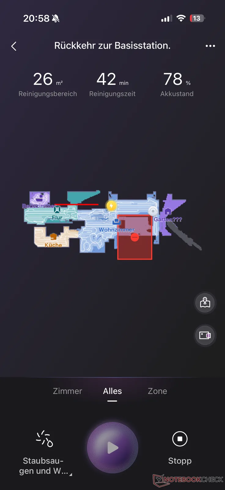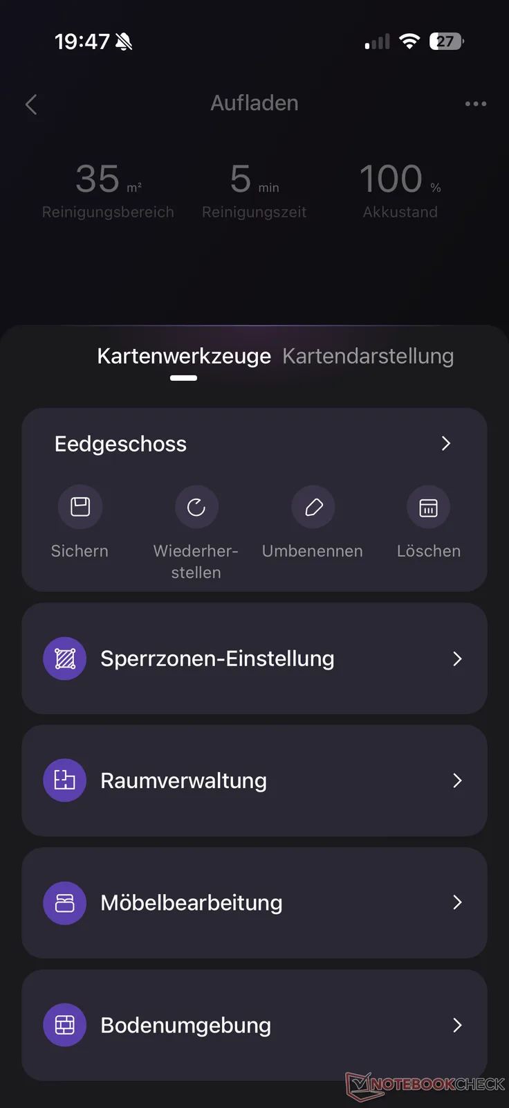 Em seguida, é feito o mapeamento usual de todos os aspiradores robôs. Aqui, o J15 Max Ultra cria um mapa virtual de seu "novo território" em poucos minutos. A divisão automática de cômodos não funcionou de forma particularmente precisa. Entre outras coisas, uma janela fechada por uma persiana foi considerada como outro cômodo atrás dela com base no reflexo. Entretanto, a maioria das imprecisões pode ser ajustada às condições reais por meio do gerenciamento do mapa, incluindo zonas restritas, soleiras, pisos e móveis. De modo geral, no entanto, gostamos mais da personalização do mapa com um ou outro fabricante, também graças aos tempos de carregamento do aplicativo, às vezes bastante longos.