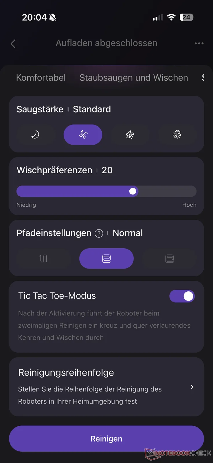 No entanto, a Eureka não é de forma alguma inferior aos líderes de mercado no que diz respeito às configurações de limpeza disponíveis. Além dos quatro modos padrão "Aspirar e esfregar", "Aspirar e depois esfregar", "Esfregar" e "Aspirar" para limpeza completa, cômodos e zonas, há também a opção de configurações individuais para cada cômodo, bem como um modo AI com ajuste automático. A potência de limpeza pode ser ajustada em quatro potências (Quiet, Standard, Turbo, Max), a umidade do esfregão em 30 níveis e a configuração do caminho em três opções (Coarse, Normal, Fine). A sequência de limpeza também pode ser definida. Tudo isso é padrão para modelos na faixa de preço superior, mas é importante.