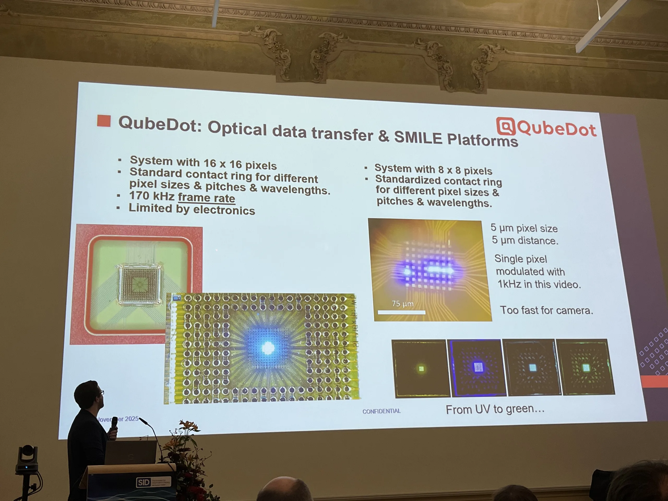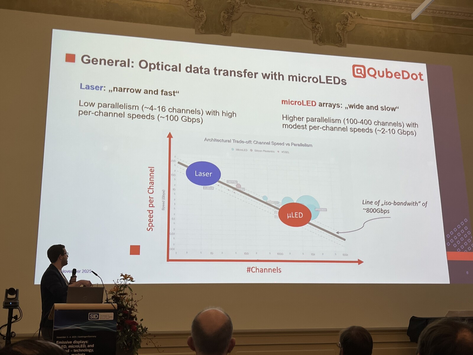 Dois desses grupos apresentaram seu trabalho na Conferência SID-MEC. O potencial é significativo, conforme demonstrado pelas apresentações da empresa francesa Aledia e da empresa alemã Qubedot. Ambas as empresas se concentram principalmente em telas microLED, e a Qubedot é especializada em pixels exclusivos que podem até se assemelhar a letras.
