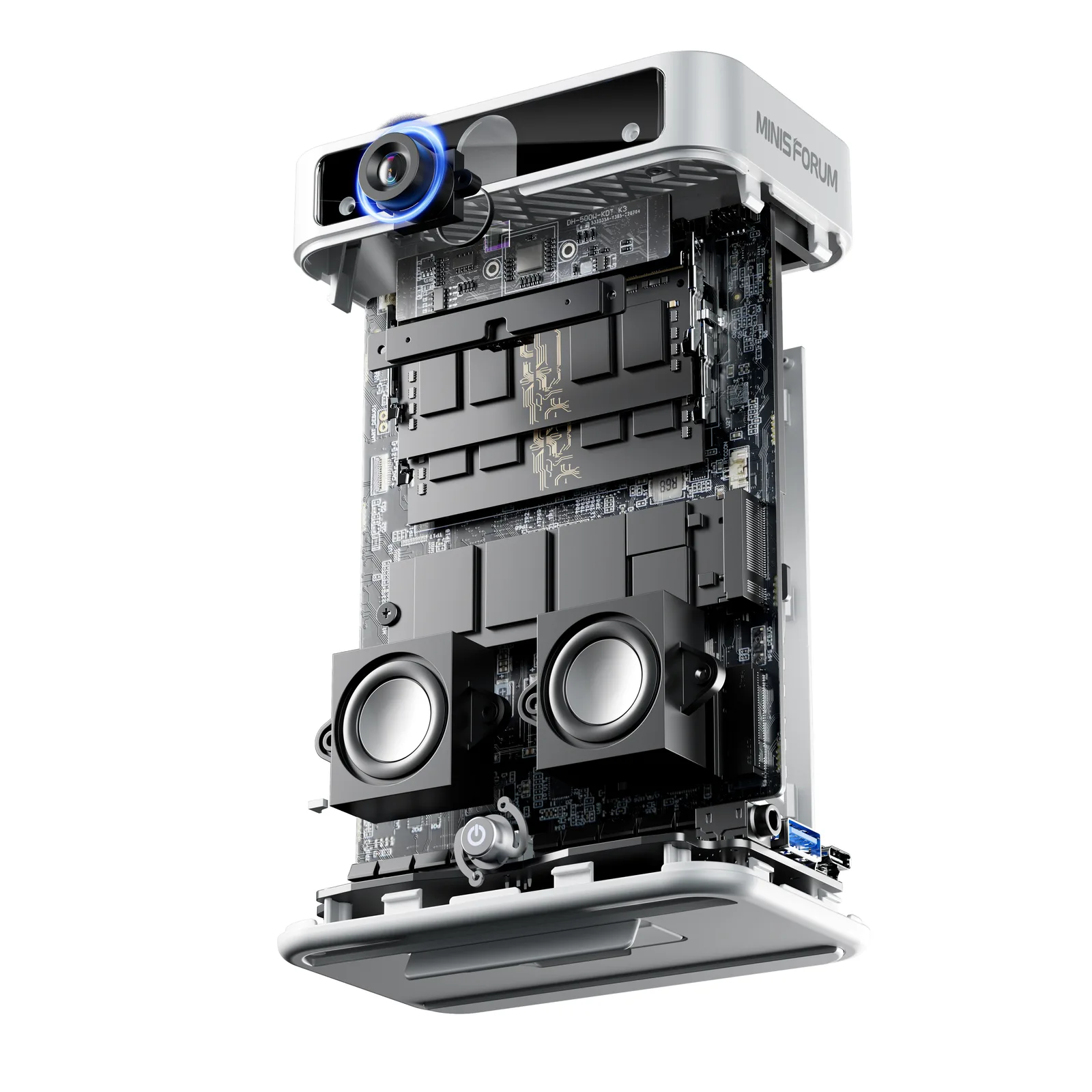 Possui uma webcam de 2,5K com suporte HDR e um campo de visão de 93,8 graus. A base ajustável oferece uma mudança de 10° de inclinação para a vista. Com a ajuda do projeto do alto-falante duplo independente 4Ω/3W, a distorção máxima do som não excede 5%, refletindo a voz humana autêntica. O microfone usa a matriz dupla MEMS com um chip DSP independente para assistência. Combinado com o algoritmo de inteligência AI, ele pode não só suprimir a reverberação, reconhecer inteligentemente a voz humana, mas também eliminar o ruído ambiental, restaurando assim com precisão a voz humana.
