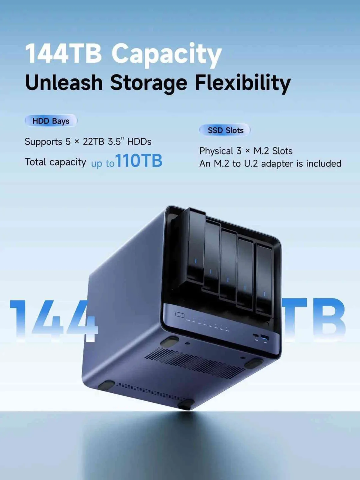 O Minisforum N5 Air oferece cinco compartimentos para HDDs tradicionais e três slots M.2 para SSDs NVMe. Um adaptador incluído permite que os usuários instalem unidades U.2 nos slots M.2. A conectividade de rede é gerenciada por duas portas Ethernet classificadas para até 5 Gbit/s e 10 Gbit/s, respectivamente. O dispositivo NAS suporta Link Aggregation, embora seu hardware de rede existente deva ser rápido o suficiente para evitar gargalos significativos em outros lugares.