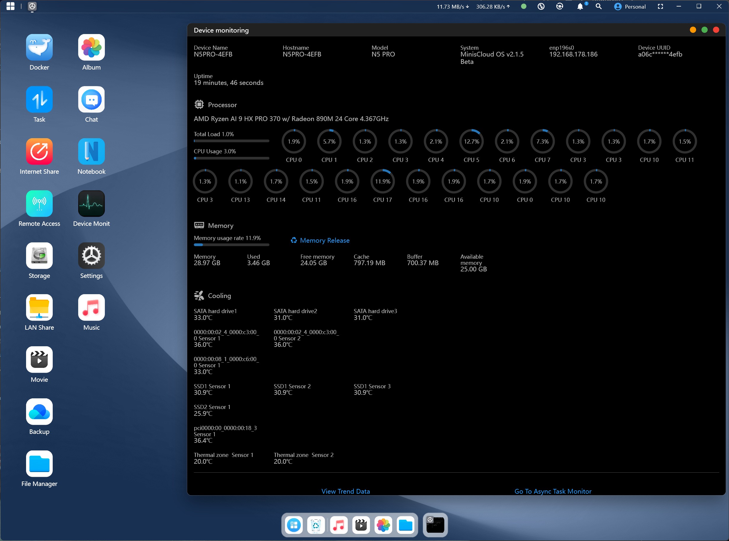 O Minisforum N5 Pro se apresenta como um NAS/mini servidor poderoso e moderno que oferece uma potência de computação impressionante com o AMD Ryzen AI 9 HX PRO 370 na arquitetura Zen 5. Com 12 núcleos, suporte a DDR5 e gráficos Radeon 890M, o sistema é igualmente adequado para multimídia, virtualização e aplicativos baseados em IA. Duas portas LAN rápidas, uma ampla gama de opções de expansão e fácil manutenção destacam o padrão profissional. Apesar de seu design compacto, o sistema de resfriamento impressiona com baixas temperaturas e níveis moderados de ruído.