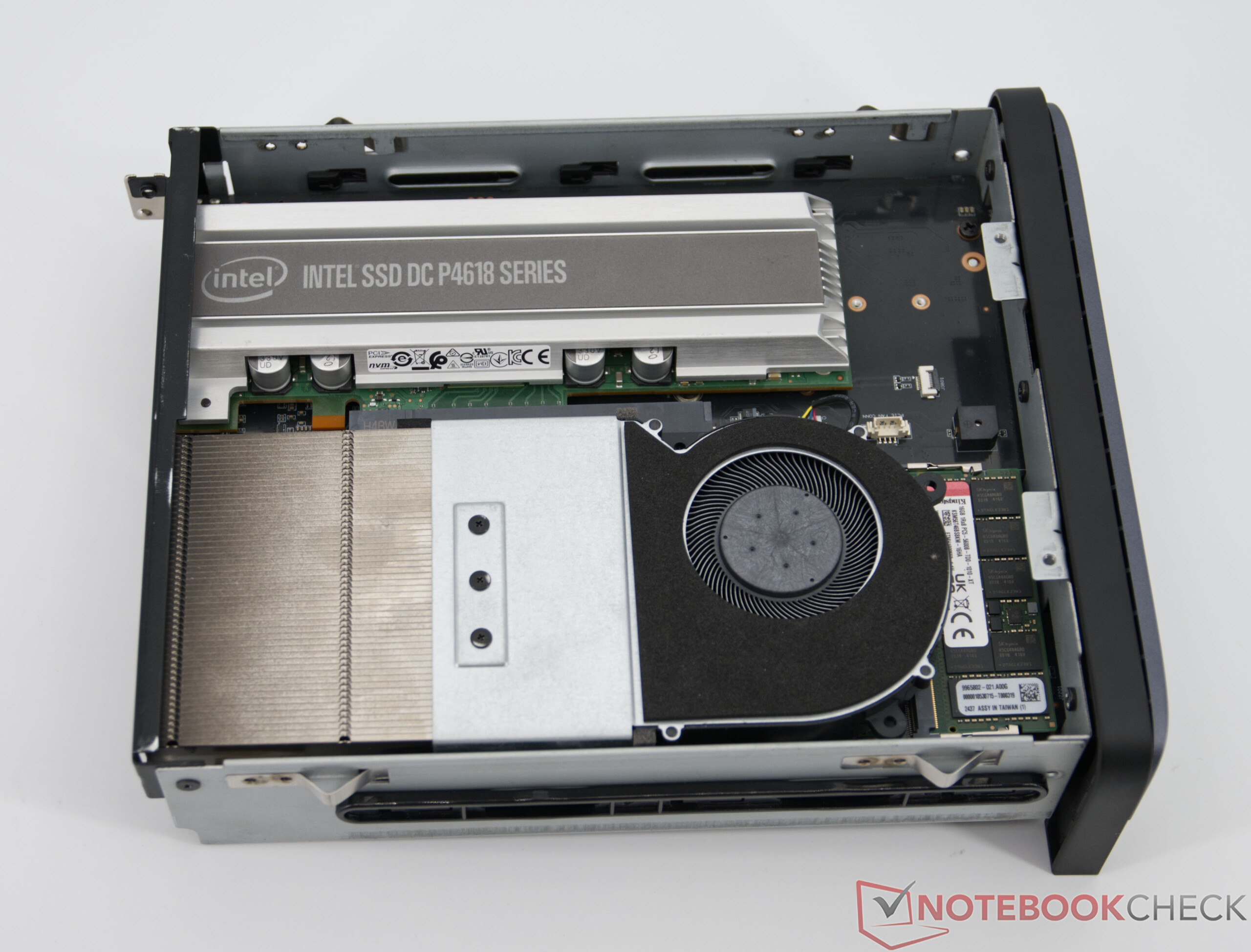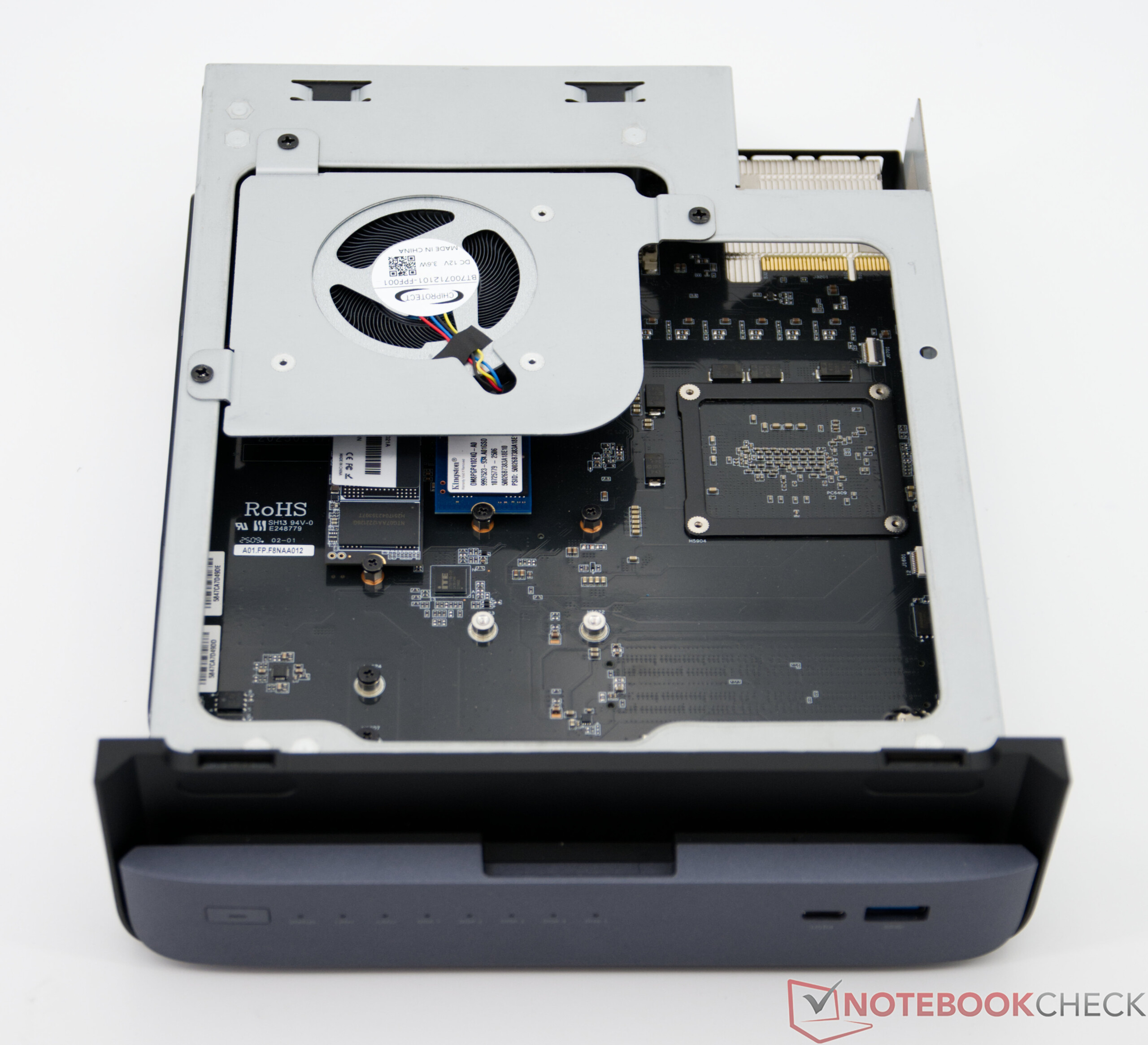 O trabalho de manutenção do Minisforum N5 Pro é agradavelmente simples. Os compartimentos de disco rígido podem ser removidos sem ferramentas e facilmente instalados. A unidade do Mini PC propriamente dita é fixada apenas com dois parafusos e pode ser facilmente puxada para fora após a remoção. Portanto, também é possível realizar expansões ou trabalhos de limpeza sem muito esforço.