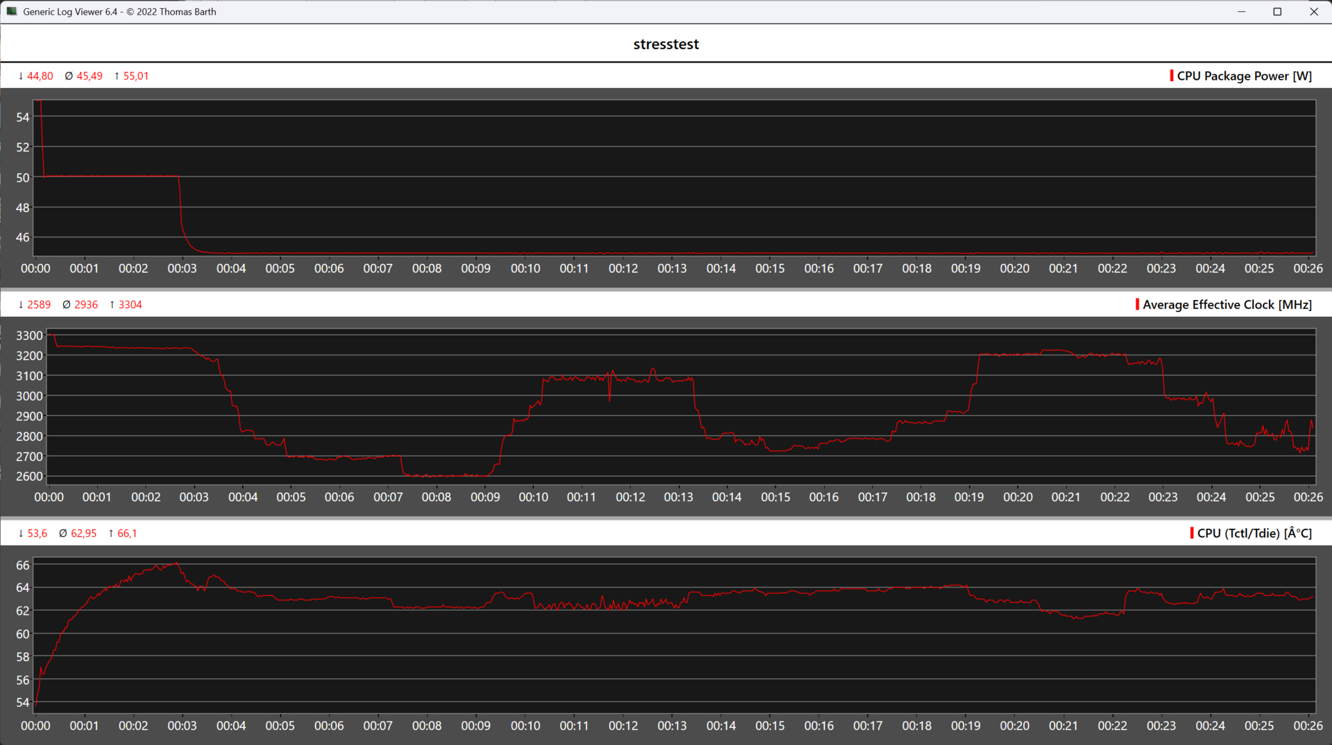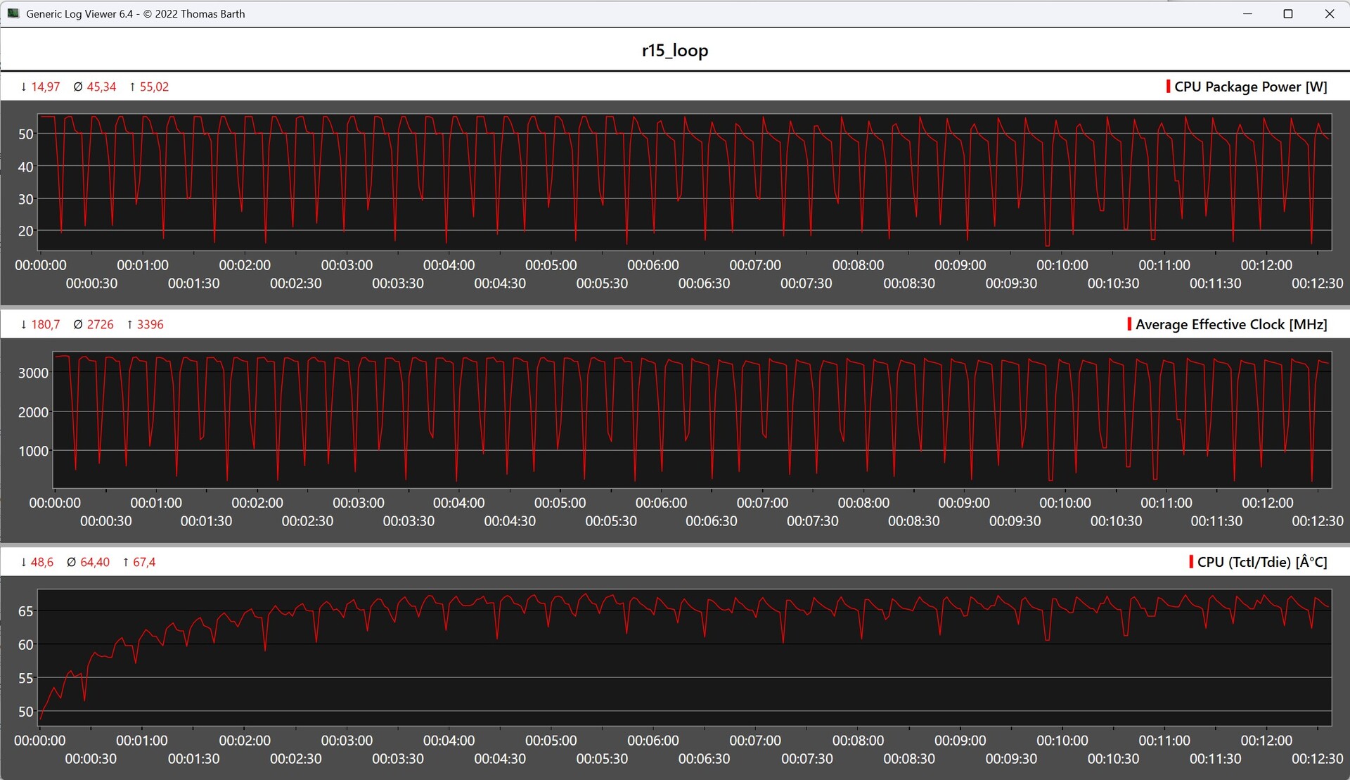O teste de resistência Cinebench R15 indica que o sistema de resfriamento do Minisforum N5 Pro é compacto, mas extremamente eficiente. Mesmo sob carga total contínua, não há perda perceptível de desempenho. O AMD Ryzen AI 9 HX PRO 370 atinge picos de desempenho de até 55 watts, enquanto o desempenho contínuo se estabiliza em torno de 45 watts. A temperatura máxima permanece agradavelmente baixa, em torno de 67,4 C.