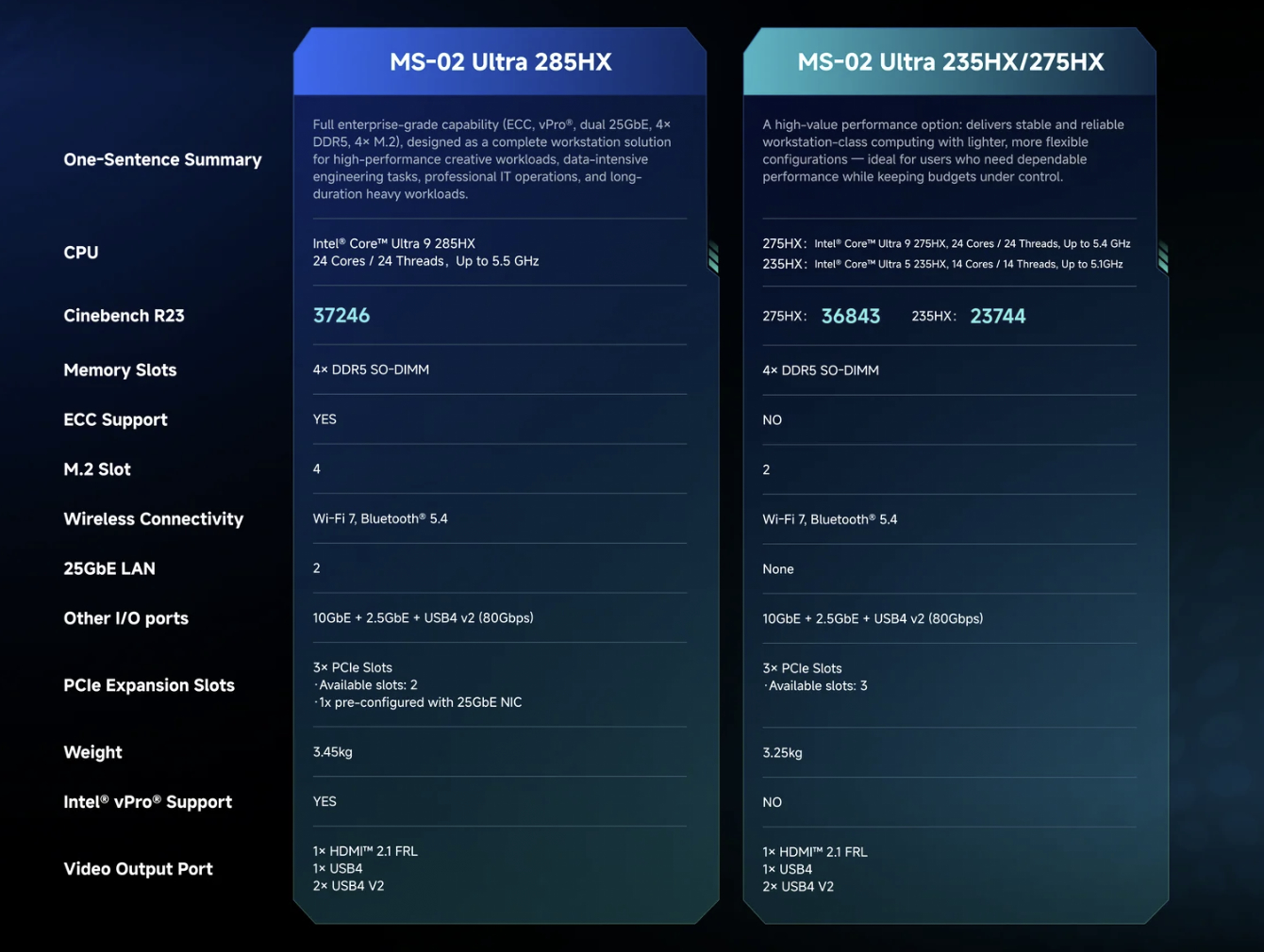 Atualmente, o MS-02 Ultra custa a partir de US$ 949 como uma unidade barebone com um Processador Core Ultra 9 275HX antes de aplicar um desconto de US$ 50 no checkout usando o código MS0250. No entanto, um processador mais barato Core Ultra 5 235HX mais barato estará disponível por US$ 719. Enquanto isso, o Core Ultra 9 285HX começa em US$ 1.119 e sobe para US$ 2.899 com 192 GB de RAM ECC e um SSD de 2 TB. Observe que somente o Core Ultra 9 285HX contêm portas Ethernet duplas de 25 Gbps.