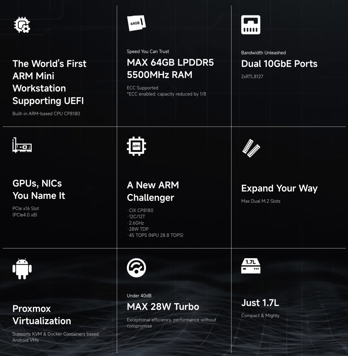 Supostamente fornecendo até 45 TOPS de computação de IA por meio de uma NPU de 28,8 TOPS, o CIX CP8180 também tem um Arm Immortalis-G720 MC10, uma versão de 10 núcleos da mesma GPU integrada no Dimensity 9400e e Dimensity 8400respectivamente. Além disso, o MS-R1 também contém as seguintes portas: