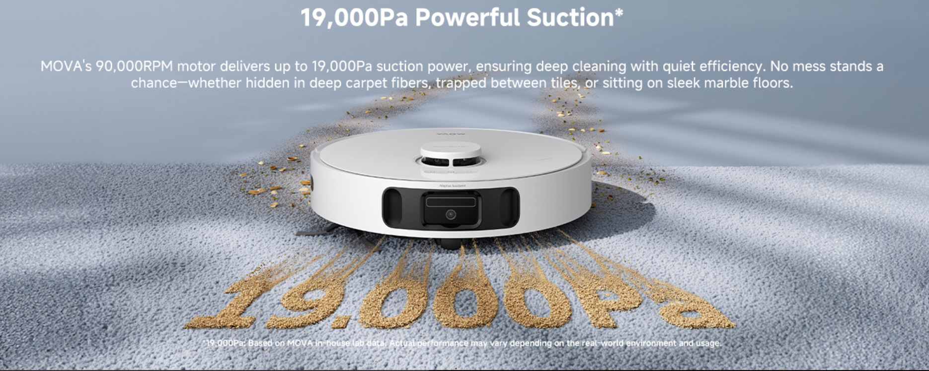O Mova E40 possui um poder de sucção particularmente alto, avaliado em 19.000 Pa. O alto poder de sucção pode ser muito benéfico para a limpeza de carpetes, mas essas afirmações devem, naturalmente, ser tratadas com certo grau de ceticismo. A escova CleanChop 3.0, um rolo central, corta os cabelos presos, enquanto a recém-projetada escova lateral sem emaranhados evita o emaranhamento dos cabelos. O próprio aspirador robô esvazia os resíduos coletados na estação base, que tem um saco de pó com capacidade de 3,2 litros. Os carpetes são detectados por meio de ultrassom - os esfregões são então levantados e a potência de sucção é aumentada.