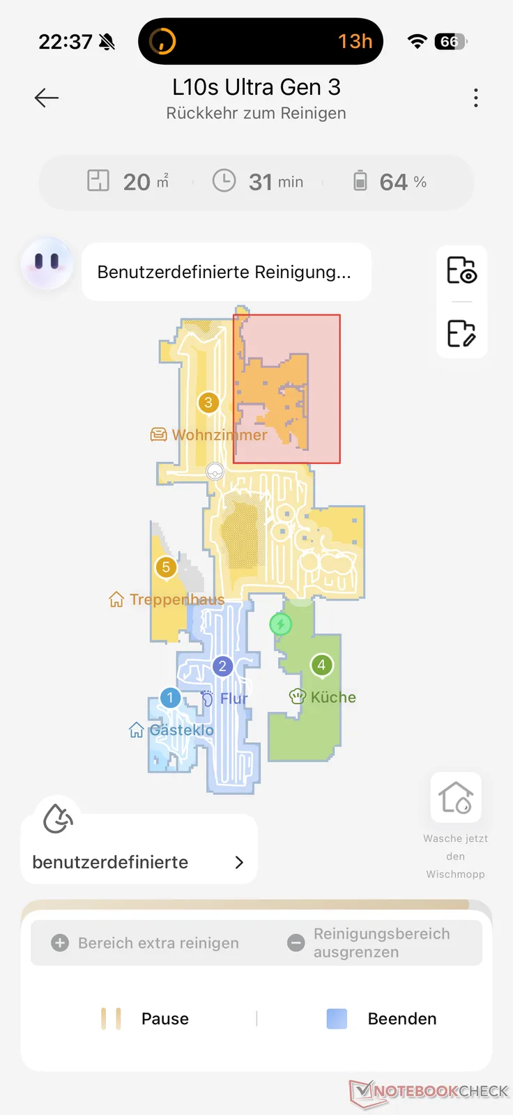 Para comparar o consumo de energia e os custos, sempre deixamos o aspirador de pó robô limpar 50 metros quadrados em nosso ambiente de teste (principalmente piso liso e um pouco de carpete) com as configurações padrão. Isso levou a um consumo de bateria de 50% para o Dreame L10s Ultra Gen 3 no teste, o que significa que 80 metros quadrados devem ser cobertos por carga de bateria.