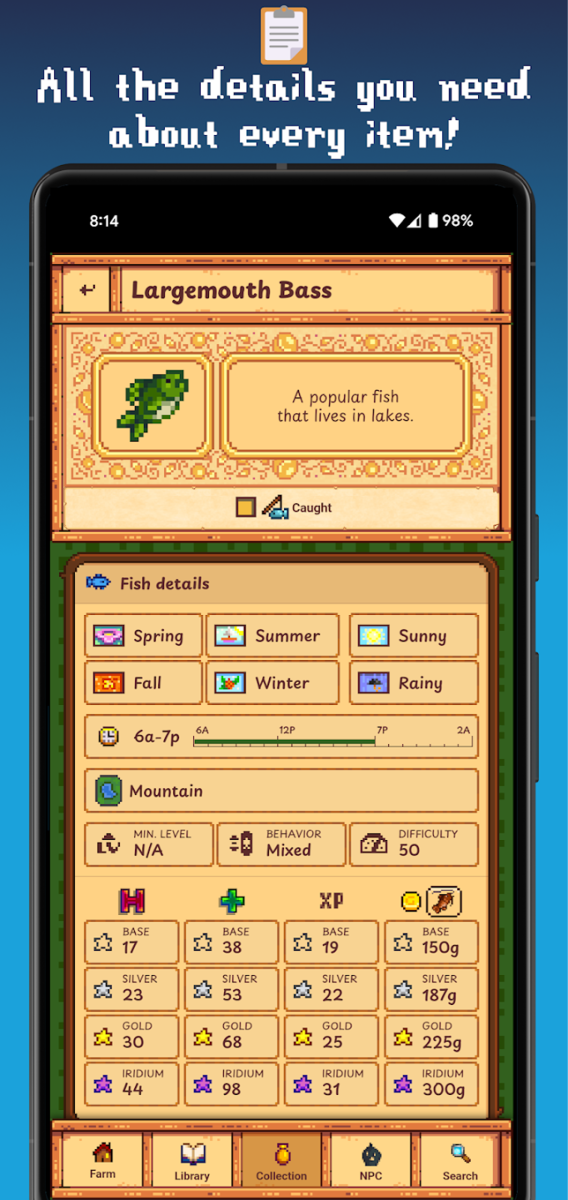 O aplicativo Stardew Valley da BlueCaret permite que os jogadores acompanhem facilmente seu progresso no jogo pelo smartphone. Ele apresenta um banco de dados completo de itens, guias para as rotas do Community Center e Joja, preferências detalhadas de presentes para todos os aldeões e listas de coleções bem organizadas. Ferramentas adicionais estão disponíveis com o upgrade premium, que custa uma taxa única de US$ 5,99. Elas incluem um rastreador de perfeição, anotações, um calendário, listas de tarefas e suporte para o gerenciamento de várias fazendas.