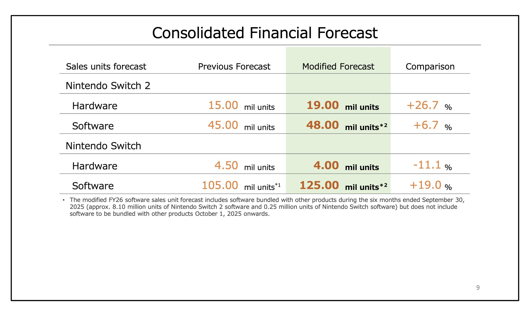 Nesse estágio, a Nintendo prevê que o Switch 2 também será mais popular do que o Switch em seu primeiro ano, que alcançou 14,86 milhões de unidades durante esse período. Não é de surpreender que as vendas do Switch 2 continuem a cair, com a Nintendo registrando uma queda de 60% em relação ao ano anterior, para 1,89 milhão de unidades. Consequentemente, a Nintendo reduziu sua previsão de hardware para o modelo legado para 4 milhões de unidades, embora as projeções de software tenham sido revisadas para cima, de 105 milhões para 125 milhões, provavelmente impulsionadas pela compatibilidade retroativa com os títulos do Switch 2 e pelo fato de Mario Kart World já ter vendido 9,57 milhões de unidades.
