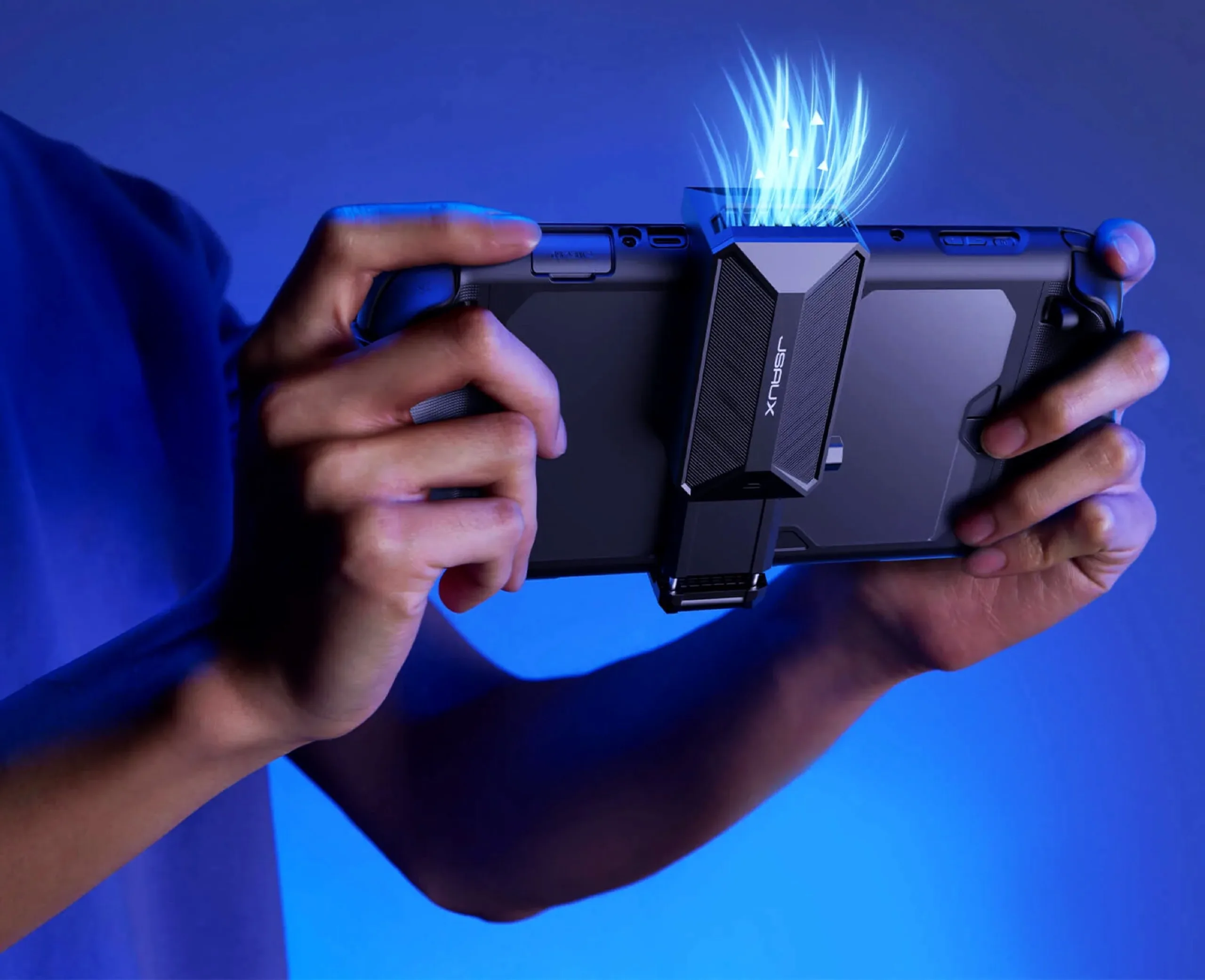 Uma porta USB-C adicional na parte traseira permite que o console carregue enquanto usa o ventilador Jsaux. Essa porta pode carregar o console com até 18 watts, e a Jsaux recomenda um carregador USB-C de 65 watts para carregar totalmente o console em três horas. A velocidade do ventilador pode ser ajustada por meio de um botão giratório, e a Jsaux observa que rotações mais altas obviamente levarão a mais ruído do ventilador.