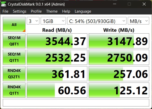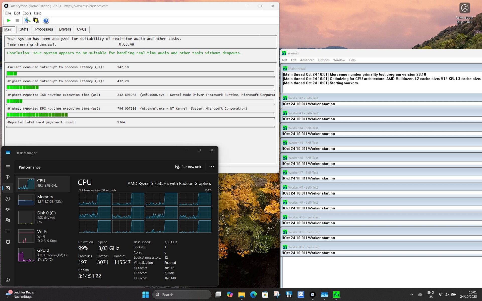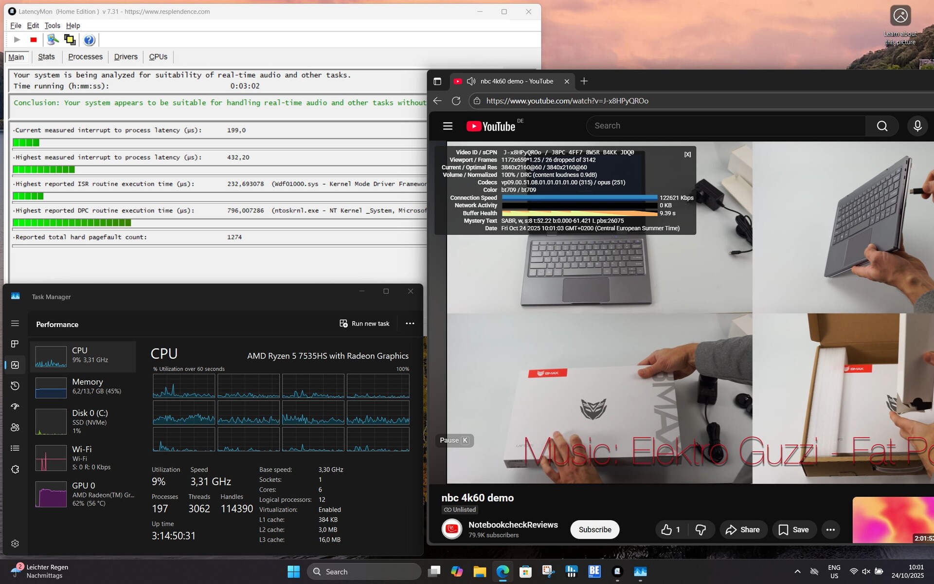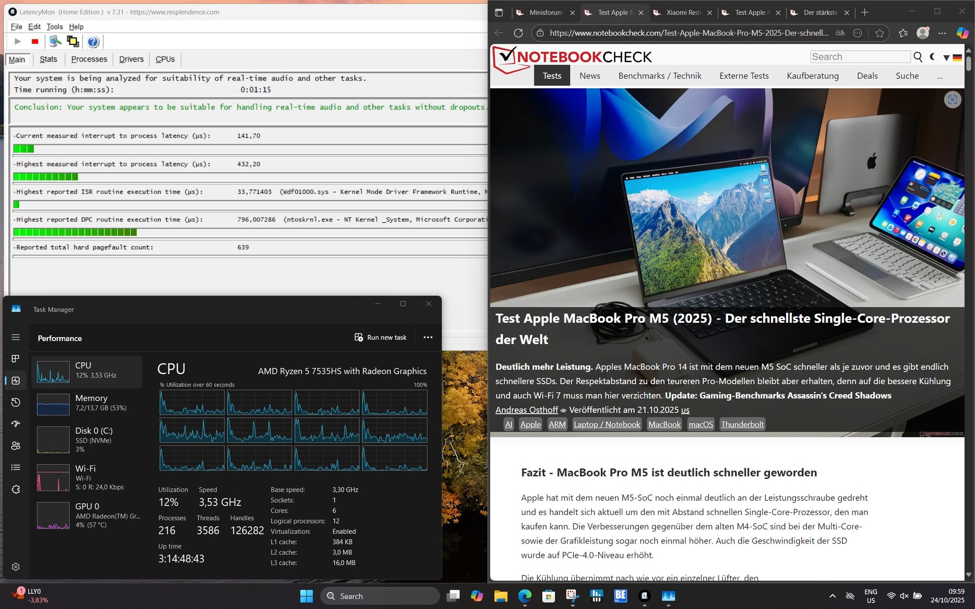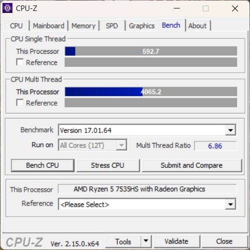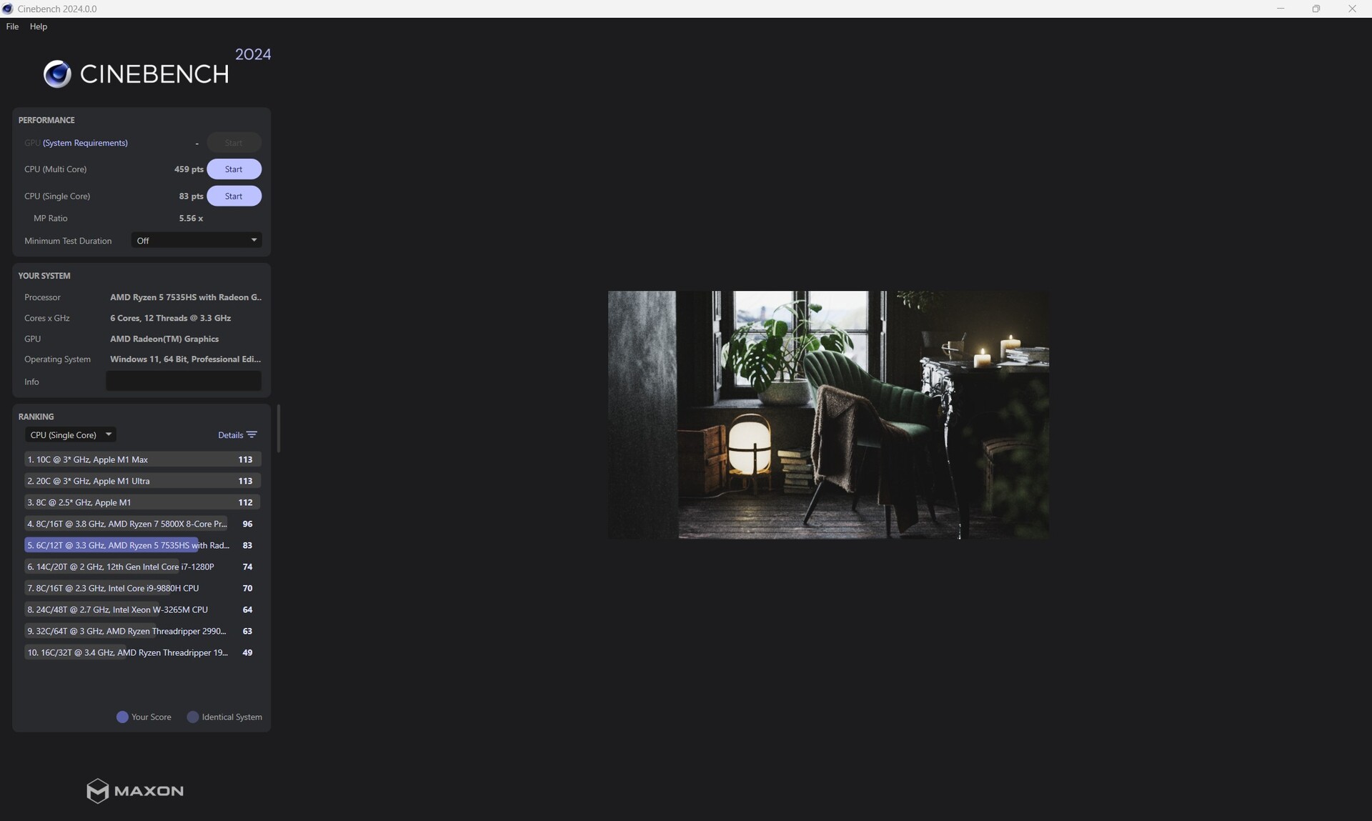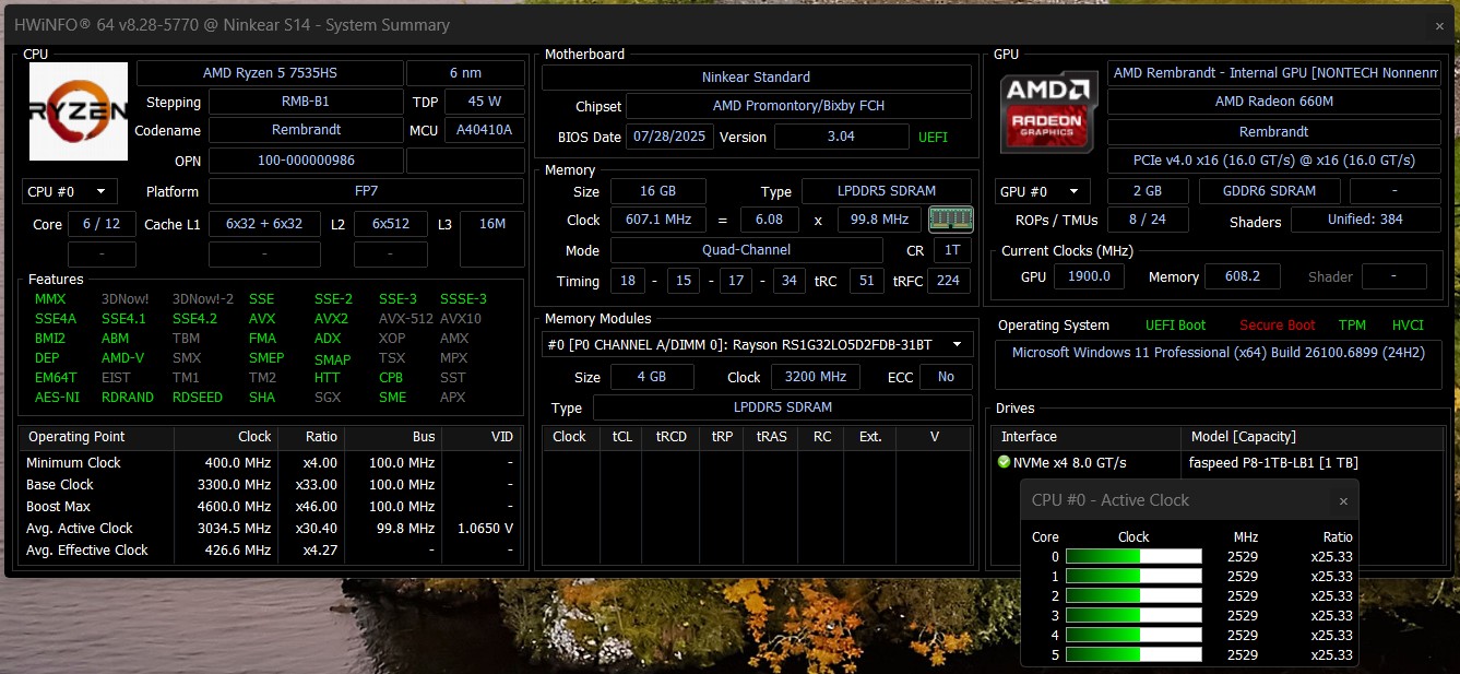 O Ninkear S14 usa o AMD Ryzen 5 7535HS, um poderoso processador de seis núcleos com doze threads que atinge velocidades de clock de até 4,55 GHz. Portanto, a CPU oferece desempenho suficiente para aplicativos típicos de escritório, multimídia e multitarefa leve. No entanto, sob carga total contínua, o desempenho é um pouco limitado pelo limite de energia do sistema, o que resulta em uma ligeira queda no desempenho em comparação com dispositivos mais altamente configurados.
