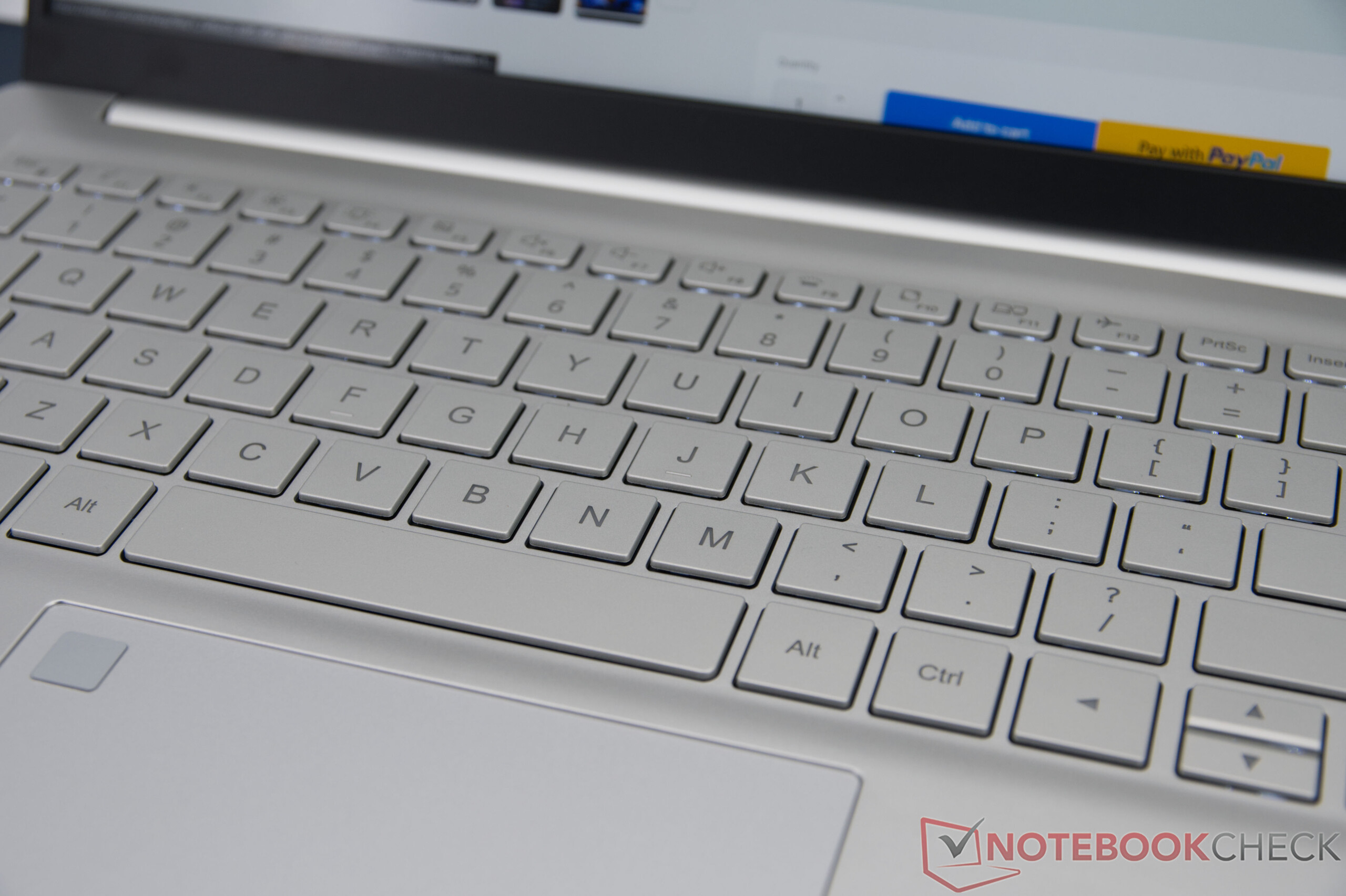 O clickpad do Ninkear S14 é agradavelmente grande, com 12 x 7,4 cm (~4,7 x 2,9 polegadas) e oferece um feedback de clique claramente definido, mas relativamente alto. As propriedades de deslizamento da superfície são boas e responsivas até as bordas. O leitor de impressões digitais integrado ocupa um pouco de espaço, mas, na prática, não chega a ser um incômodo no canto superior esquerdo.