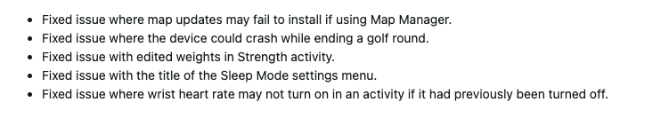 Além disso, há uma correção para o título do menu de configurações do Modo de suspensão. Além disso, a Garmin solucionou um problema em que o registro da frequência cardíaca no pulso não era iniciado automaticamente quando já havia sido desativado para uma determinada atividade.
