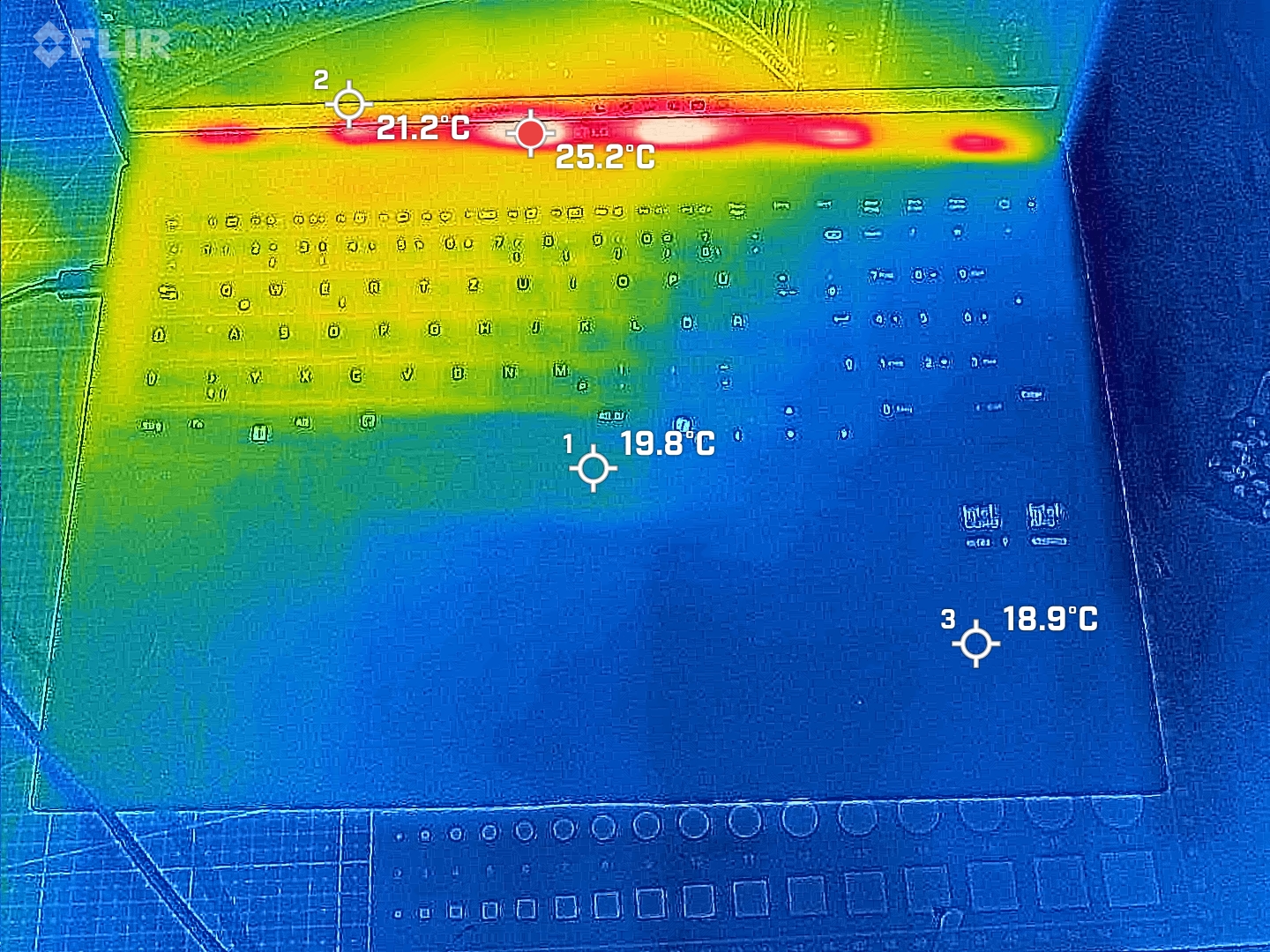 O desenvolvimento da temperatura depende claramente do modo de desempenho selecionado. Especialmente na operação "Silenciosa", a carcaça se aquece visivelmente com o tempo até que os ventiladores intervêm (permanecendo quase inaudíveis). Mesmo em testes de estresse com desempenho máximo de resfriamento, o Gram não se mantém exatamente frio.