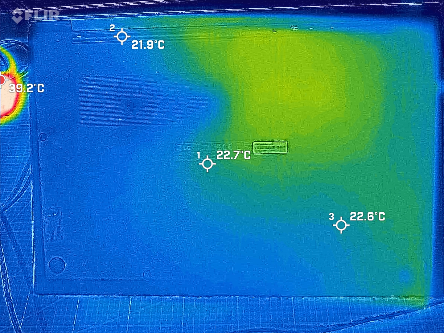 (±) A temperatura máxima no lado superior é 41 °C / 106 F, em comparação com a média de 34.3 °C / 94 F , variando de 21.2 a 62.5 °C para a classe Office.