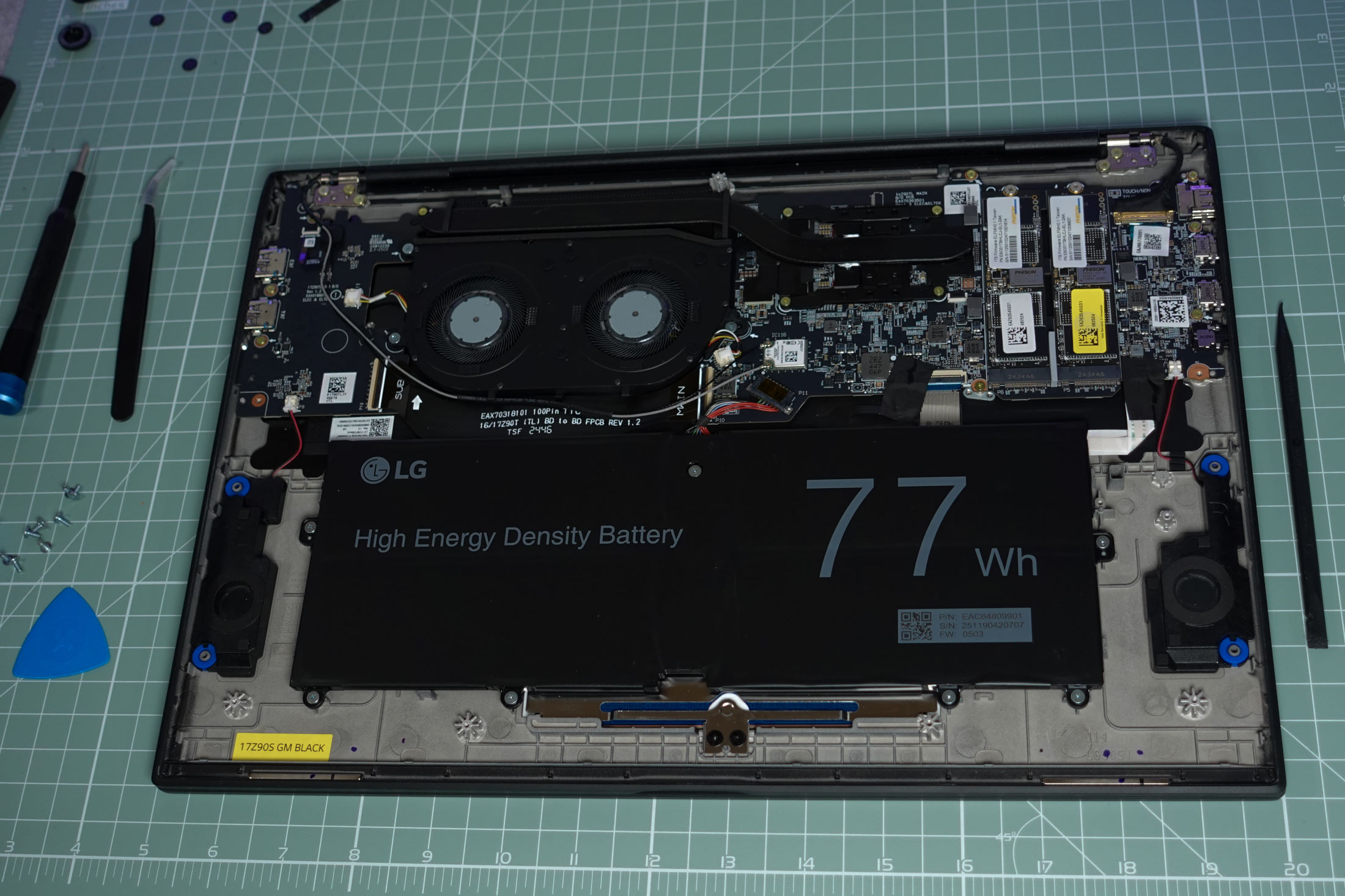 Dentro do Gram, a construção não é altamente modular. No entanto, componentes como a bateria, os alto-falantes e as ventoinhas não são colados no lugar. Isso significa que eles podem ser substituídos facilmente.