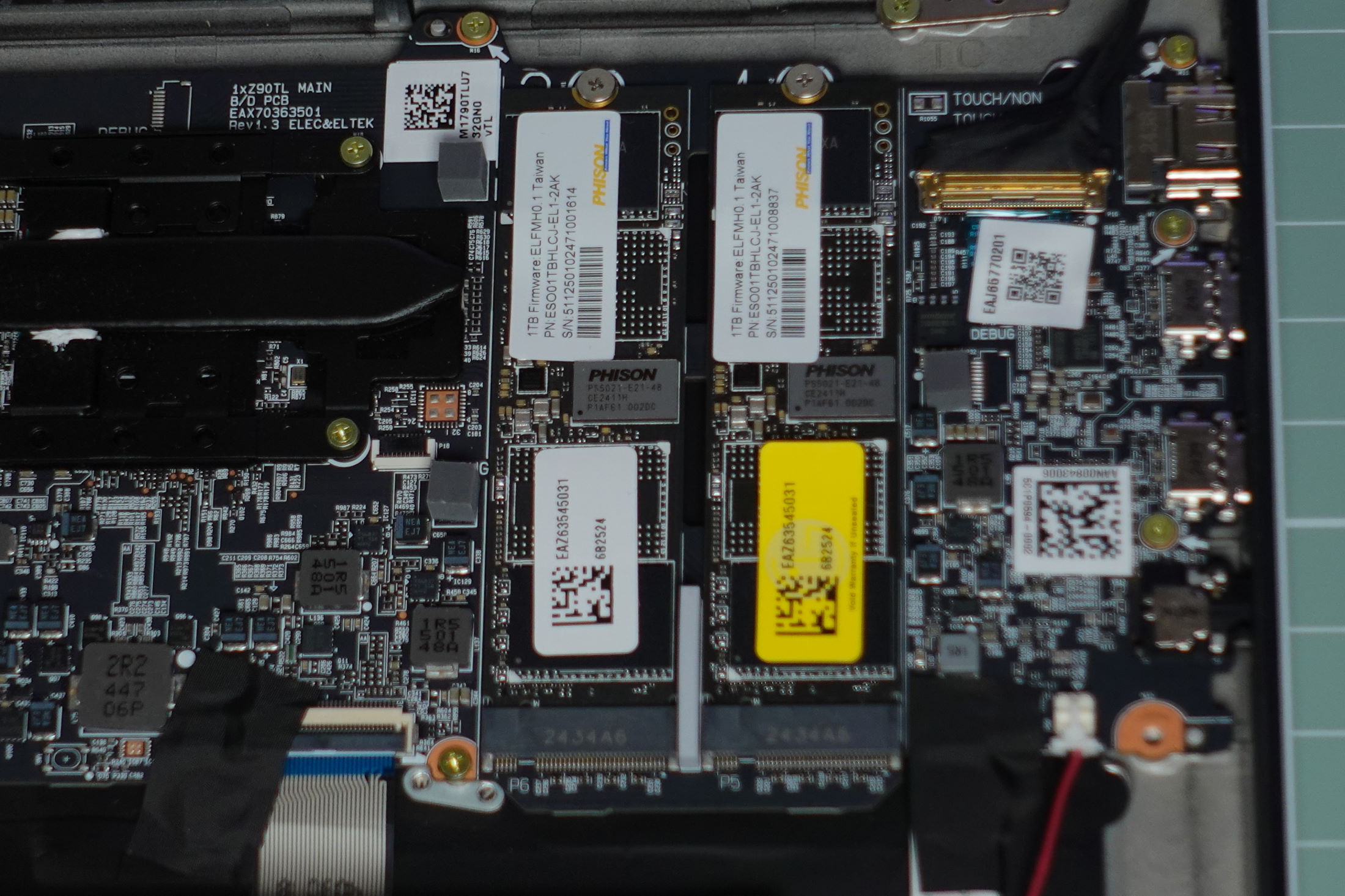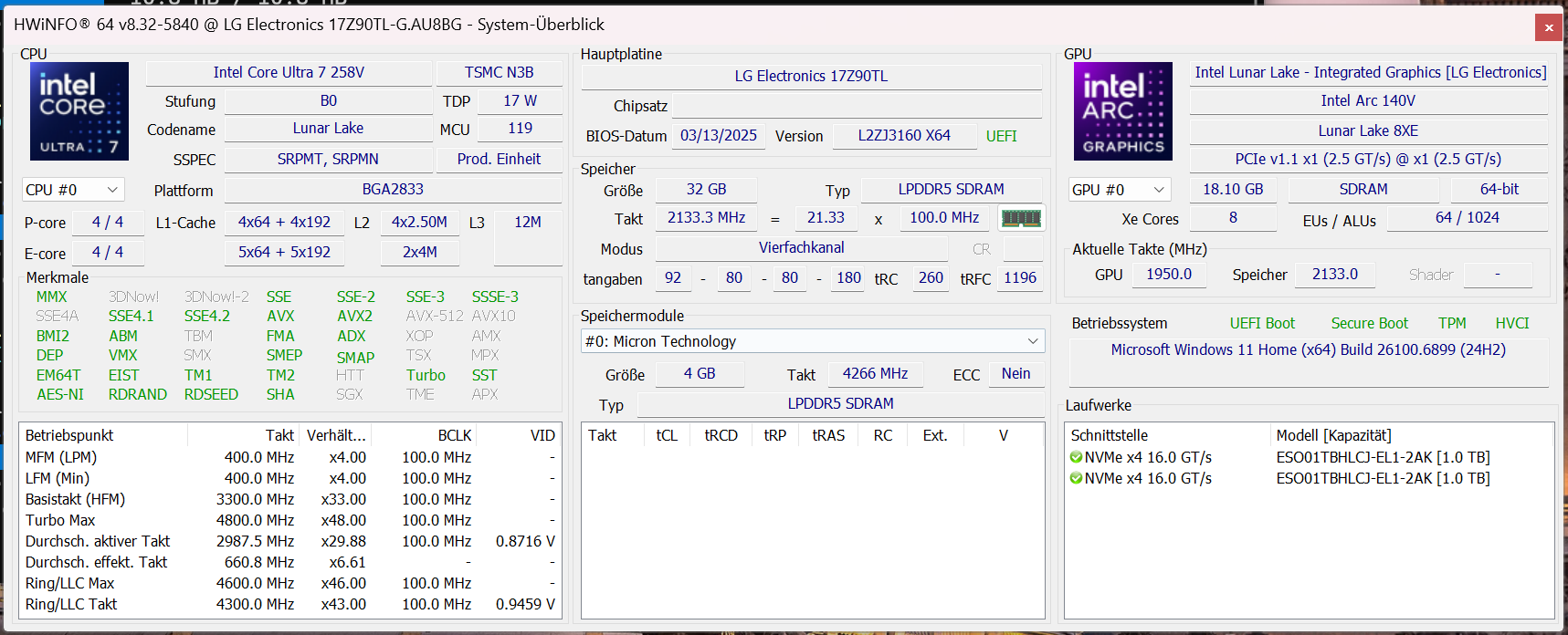 Com o Lunar Lake, a Intel está abrindo novos caminhos no design de processadores. O foco aqui é menos o multi-threading e muito mais a eficiência energética superior. A RAM é integrada diretamente ao pacote do processador com essas CPUs, o que limita as configurações de memória disponíveis. Atualmente, os modelos Gram com processadores Lunar Lake estão disponíveis apenas com o Core Ultra 7 256V ou o 258V. Isso se traduz em configurações com 16 GB ou 32 GB de RAM. Nossa unidade de teste utiliza a configuração de 32 GB. Além disso, há várias configurações de armazenamento disponíveis no mercado. Nosso dispositivo veio equipado com dois SSDs NVMe, cada um fornecendo 1 TB de armazenamento.
