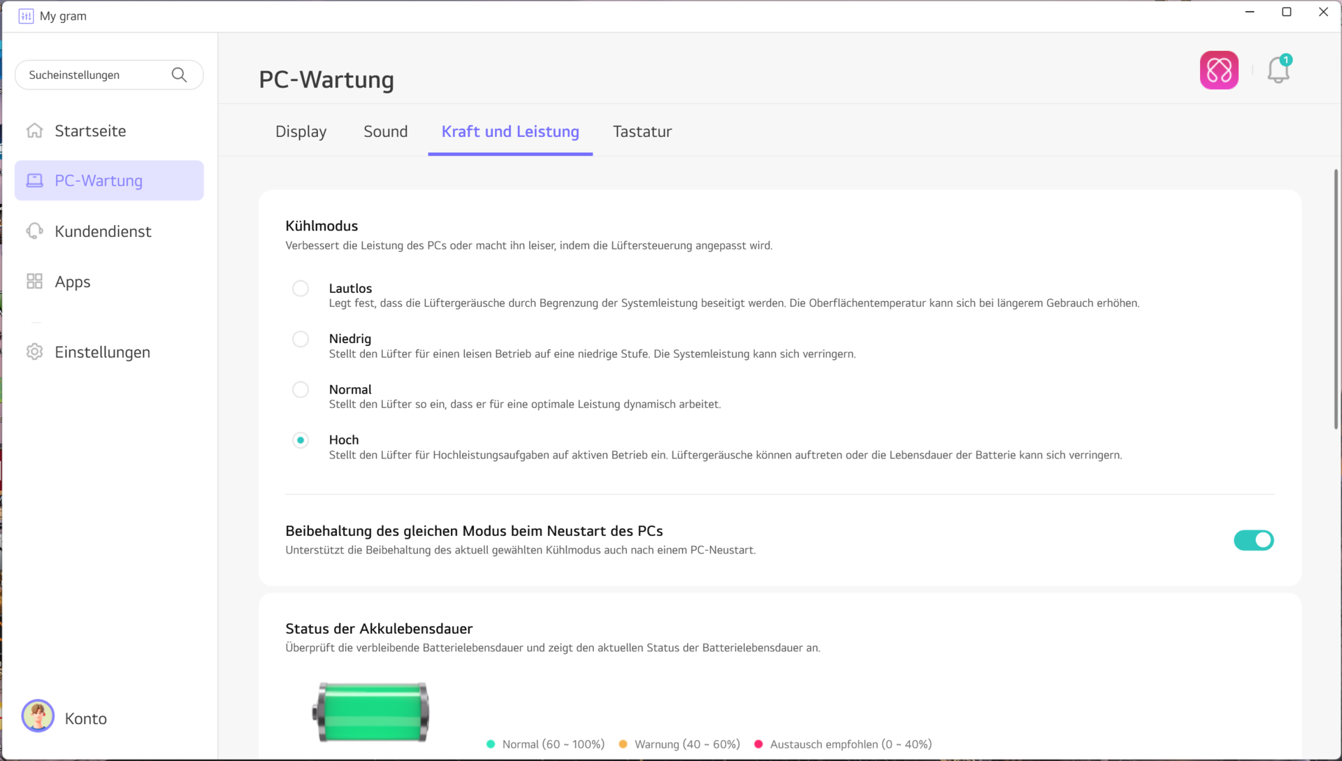No aplicativo MyGram, quatro perfis de desempenho diferentes são pré-configurados. Essas predefinições variam de ventoinhas (quase) silenciosas a alta utilização da ventoinha. No entanto, descobrimos durante as medições de ruído do teste de estresse que, em cenários exigentes, a configuração "Normal" e o modo de resfriamento "High" diferiam em apenas um ou dois dB(A). Por esse motivo, optamos por usar o modo de resfriamento mais forte em todos os nossos benchmarks e medições.
