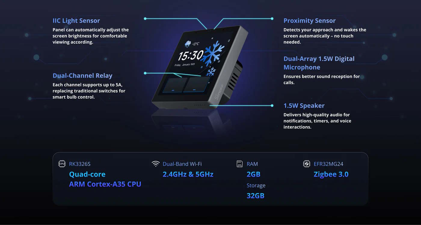 O hardware inclui dois microfones para comandos de voz. O SoC RK3326-S é combinado com 2 GB de RAM e 32 GB de armazenamento interno. A tela de 3,95 polegadas tem uma resolução de 480 × 480 pixels e é sensível ao toque. Seu brilho também pode ser controlado por meio de um sensor de brilho, o que facilita a leitura durante o dia e não causa distração à noite. O NSPanel Pro Gen 2 pode detectar quando uma pessoa está na frente do dispositivo. Há um alto-falante embutido. Diz-se também que ele é capaz de exibir imagens de câmeras de vigilância. No momento, o modelo está disponível para encomenda por cerca de US$ 120, e o envio está previsto para começar em junho.