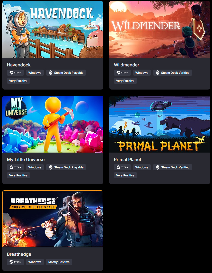 - Breathedge - um jogo de sobrevivência em mundo aberto com mecânica de criação e boa recepção geral dos jogadores. Está marcado como Steam Deck Unsupported, mas funciona muito bem no dispositivo portátil de jogos com alguns ajustes. O preço de varejo é de US$ 24,99, e o preço mais baixo de todos os tempos é de US$ 6,24.