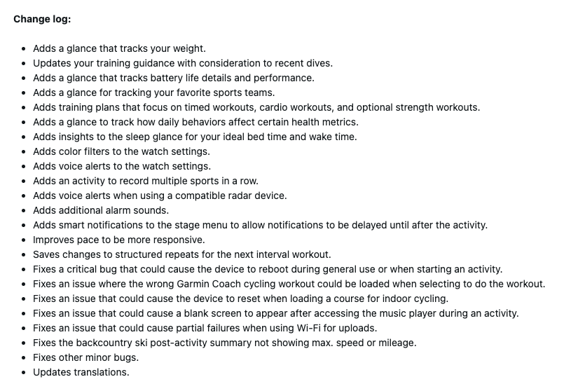 Embora o registro de alterações (captura de tela abaixo) liste muitas alterações, algumas delas foram incluídas em versões mais antigas. As novidades da versão beta 16.28 são mais sons de alarme e a capacidade de adiar as notificações até depois de uma atividade, graças à adição dessas notificações ao menu de etapas. Além disso, o Garmin Connect Mobile Translations foi atualizado para a versão 3.50.