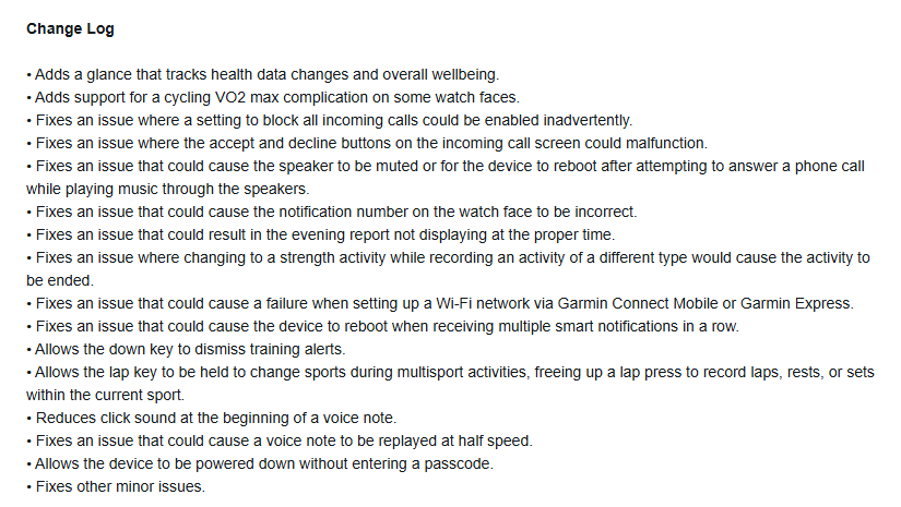 Depois de instalar a versão beta 15.07, os usuários dos smartwatches Forerunner 570 e Forerunner 970 poderão usar a tecla para baixo para descartar alertas de treinamento, manter pressionada a tecla de volta para alternar entre esportes durante uma atividade multiesportiva e desligar o dispositivo sem uma senha. Além disso, há uma ampla gama de correções de bugs que abordam problemas relacionados a chamadas recebidas, relatório noturno e atividade de força. A Garmin também indica que reduziu o ruído de clique reproduzido no início de uma nota de voz. O senhor pode encontrar uma captura de tela do registro completo de alterações abaixo.
