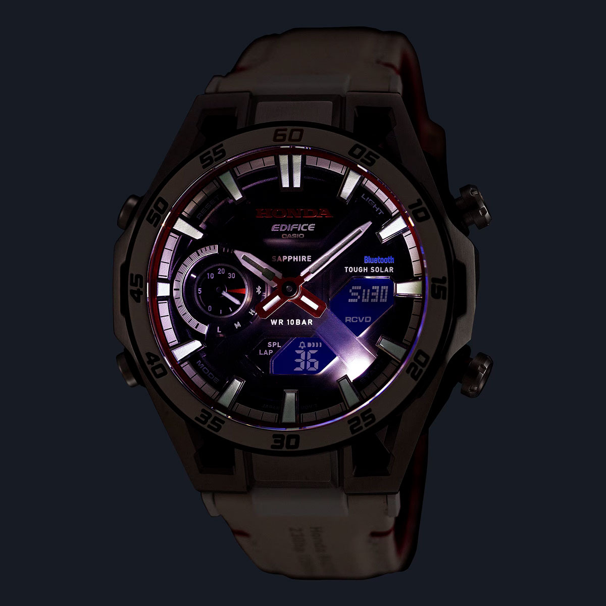 Muitos detalhes do design fazem referência direta à herança automobilística da Honda. O bezel de cerâmica branca que se destaca é da mesma cor do Championship White - a cor oficial da vitória dos carros Honda, também com um "60" em dourado para marcar o ano histórico. A escala do bezel é contada em incrementos de cinco segundos, um detalhe interessante que não é encontrado nos modelos ECB-2300 básicos.