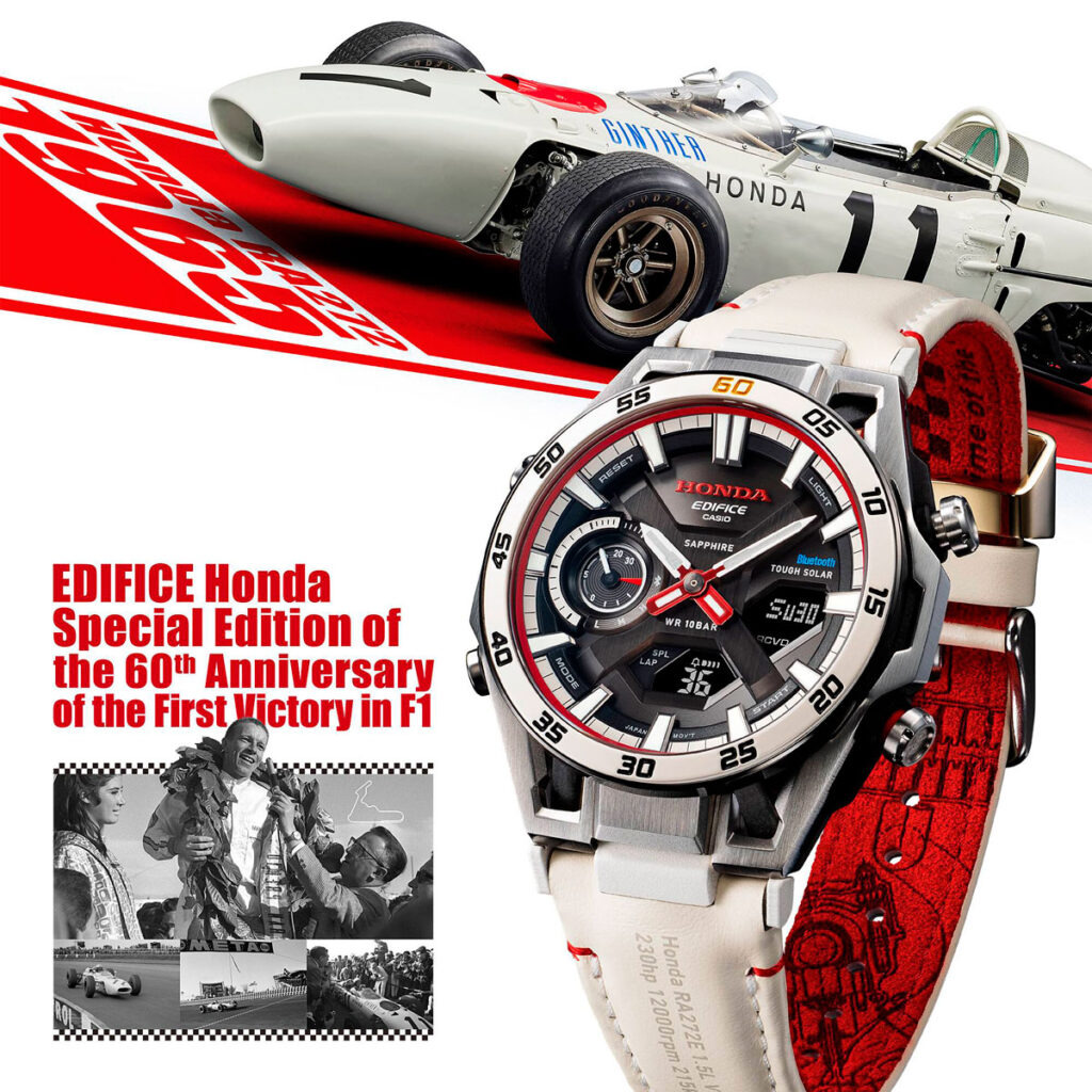 Em meio a uma série de novos relógios Casio que chegam neste outono, a fabricante japonesa de relógios apresentou o ECB-2300HR-1Aum modelo especial Edifice Honda em comemoração ao 60º aniversário da primeira vitória de Honda no Grande Prêmio de Fórmula 1. É um modelo de edição limitada e tem inspirações vintage (e técnicas) da vitória da Honda na F1 de 1965 no México com o RA272, o primeiro carro e equipe japoneses a triunfar nesse nível.