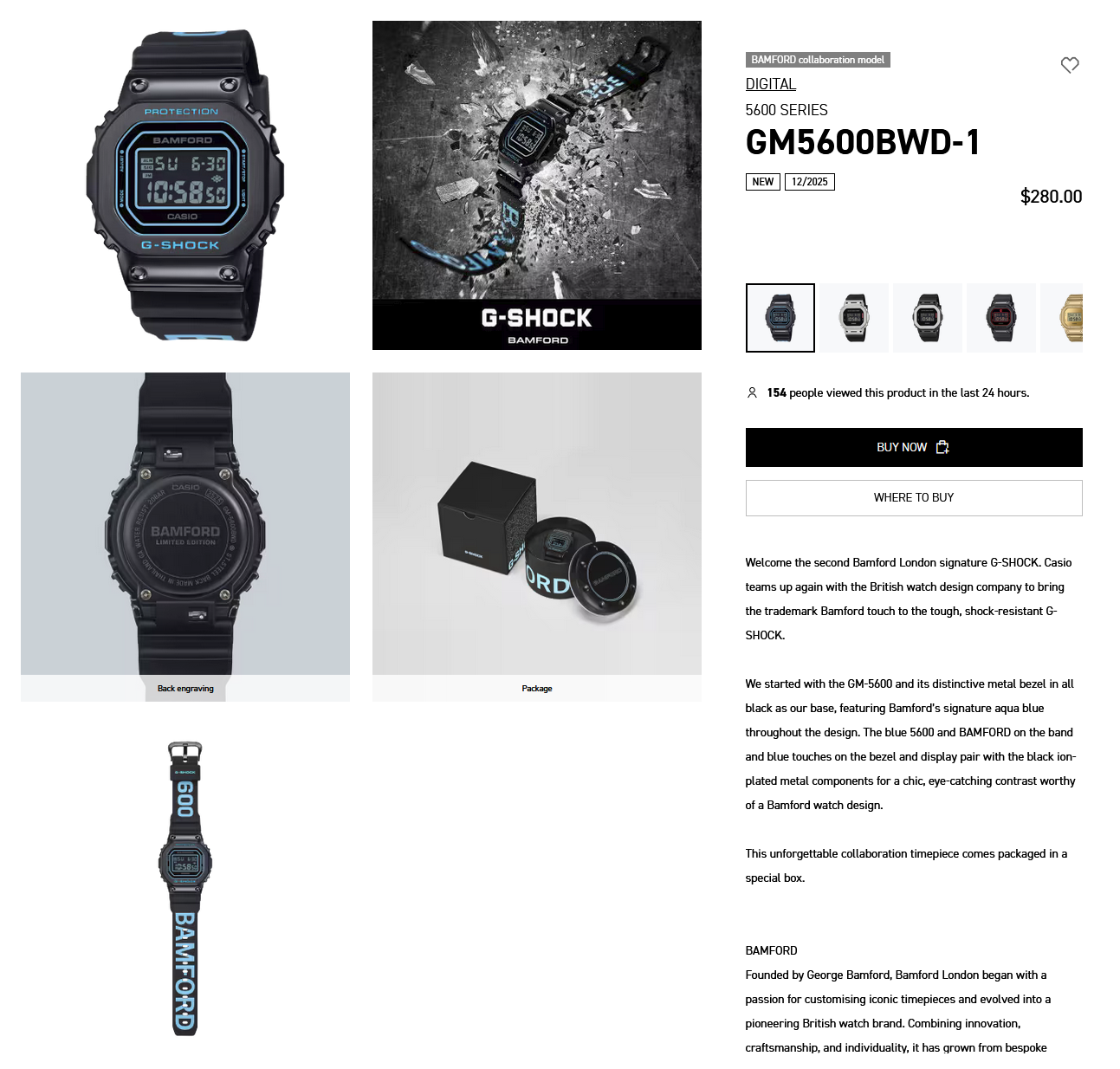 A Casio lista a pulseira como uma pulseira de resina de base biológica, dimensionada para se ajustar a pulsos entre 145 mm e 215 mm. O relógio usa vidro mineral em vez de safira. Para os compradores dos EUA, o relógio é vendido diretamente pelo site da Casio e enviado em uma embalagem especial com a marca Bamford. Embora não seja uma edição limitada numerada, a disponibilidade parece ser mais controlada do que os lançamentos padrão do GM-5600, o que pode manter o estoque em movimento em lotes menores.