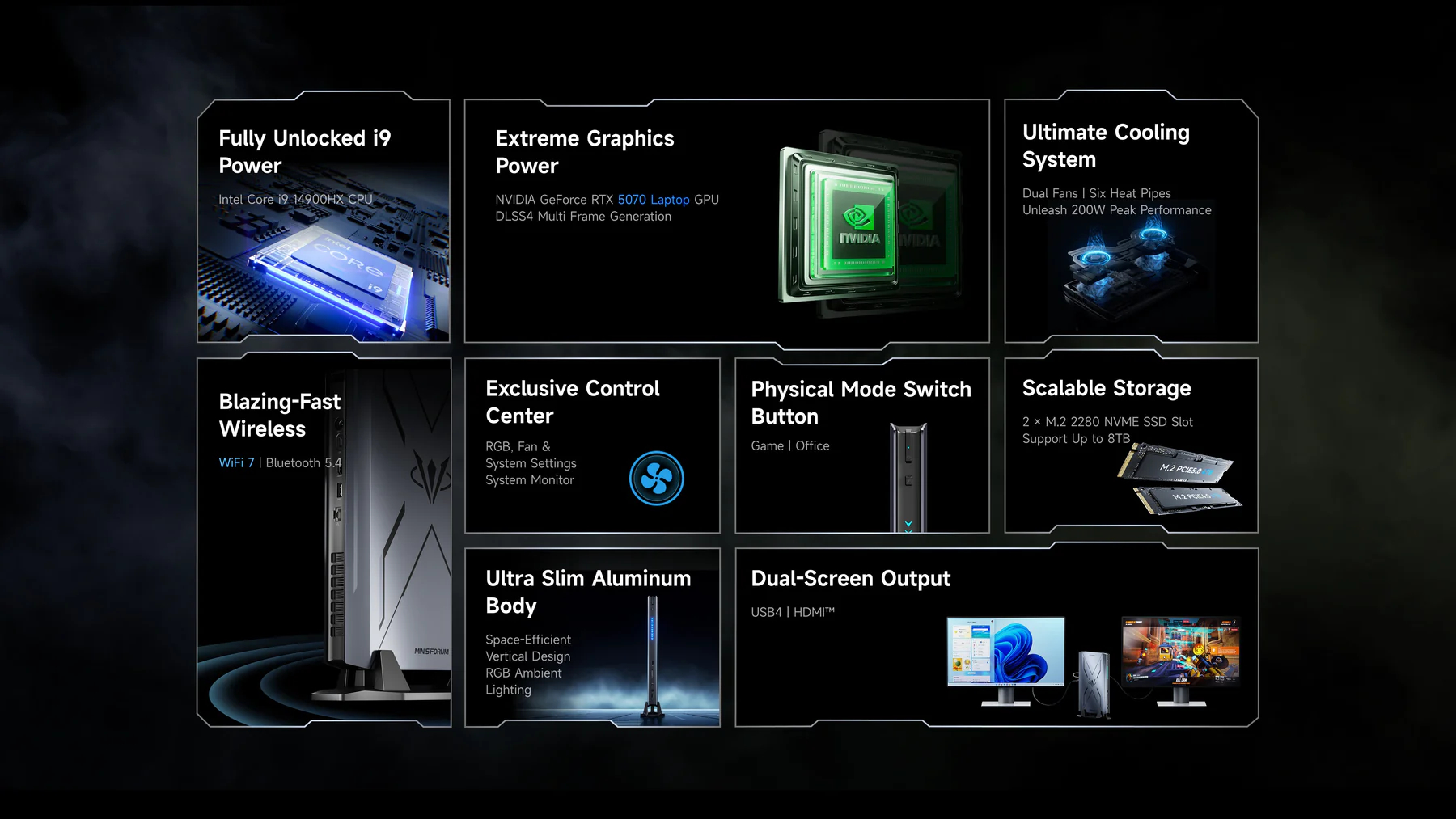 Além disso, o AtomMan G7 Pro só pode ser configurado com uma Nvidia GeForce RTX 5070 que a Minisforum mantém resfriada com seis tubos de calor, duas ventoinhas e um sistema de exaustão de três lados. Aparentemente, esse sistema de resfriamento permite que o AtomMan G7 Pro extraia até 200 W durante os testes de estresse com o Modo Jogo ativado. Caso contrário, o mini-PC consumirá até 150 W no "Modo Escritório".