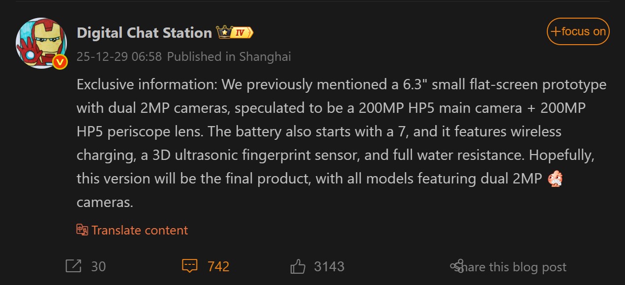 Esse painel OLED plano teria um sensor ultrassônico 3D de impressão digital no display. O que é bastante interessante é que a Digital Chat Station acrescenta que o Find X9s terá uma configuração de câmera dupla de 200 MP. O vazador compartilha que se espera que ele tenha uma HP5 de 200 MP de 200 MP como câmera principal e como sensor de telefoto.