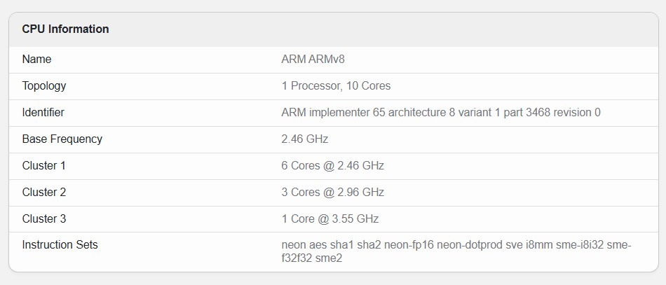 Dito isso, há um motivo técnico claro para a queda nas pontuações: uma mudança na configuração de teste do chip. O registro mais recente do Geekbench mostra que o Exynos 2600 foi testado com frequências de CPU significativamente reduzidas em comparação com as versões anteriores. Anteriormente, o chip estava funcionando com seis núcleos a 2,76 GHz, três núcleos a 3,26 GHz e um núcleo a 3,80 GHz. Enquanto isso, novos testes mostram uma configuração de CPU com 6 núcleos a 2,46 GHz, 3 núcleos a 2,96 GHz e 1 núcleo a 3,55 GHz.