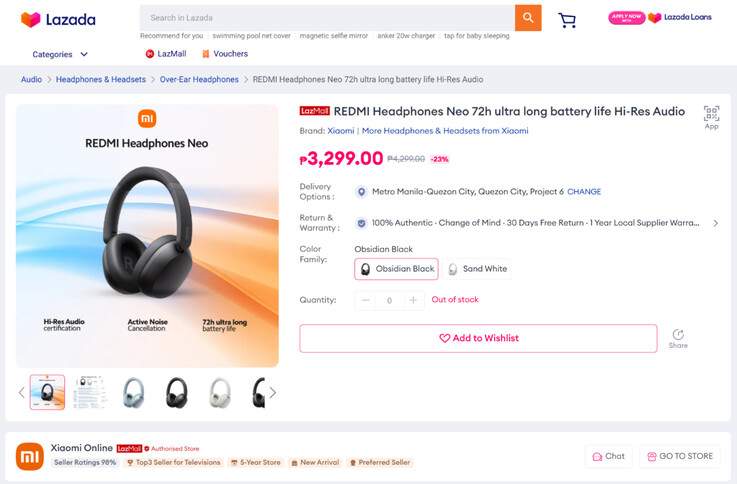 A Xiaomi lançará inicialmente o Redmi Headphones Neo nas cores Obsidian Black e Sand White. Como mostram as imagens abaixo, a Lazada fixou o preço do Redmi Headphones Neo em PHP 3.299 (~$55) nas Filipinas, com desconto em relação aos PHP 4.299 (~$70). Enquanto isso, a Diglex Electronics listou os mesmos fones de ouvido por US$ 36,70, mas com uma quantidade mínima de pedido de 100 unidades.