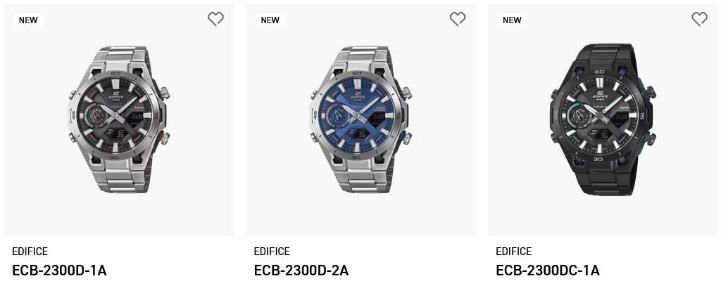 Casio adicionou três referências do Edifice Sospensione ECB-2300 ao seu site internacional: ECB-2300D-1A, ECB-2300D-2Ae ECB-2300DC-1Aindicando uma implementação mais ampla além do Japão. Páginas de produtos dedicadas aos modelos inoxidáveis (D-1A, D-2A) e à versão de íons negros (DC-1A) já estão no ar no site global