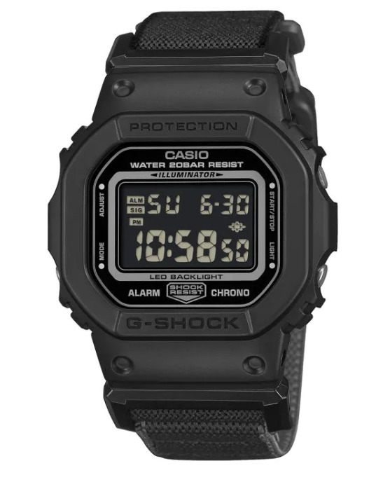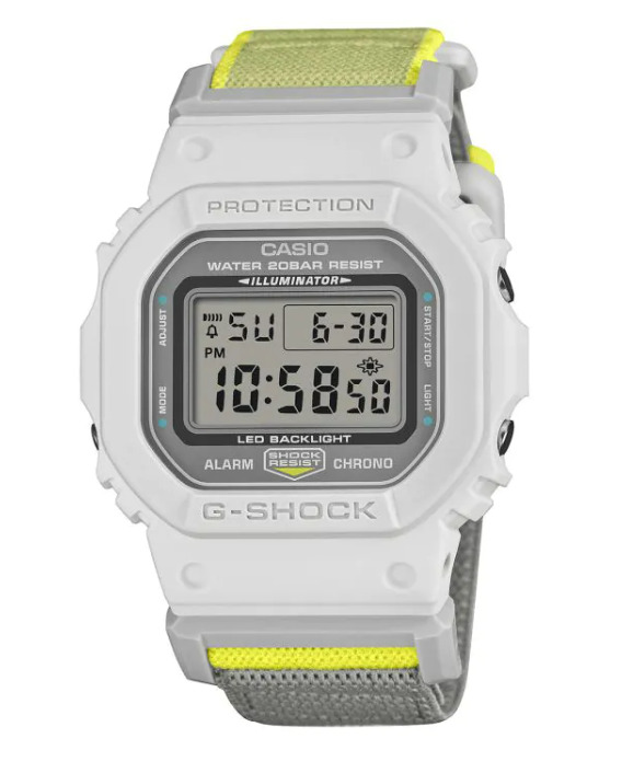 As pulseiras são o que torna essa próxima série tão exclusiva. Em vez da habitual pulseira de resina, os modelos DW-5600MNC apresentam uma pulseira cruzada em estilo de tecido. O tecido parece ser em camadas, com textura visível e revestimentos internos contrastantes. Em uma variante cinza-clara (DW-5600MNC-7A8), a pulseira mostra um acento interno amarelo brilhante que aparece nas bordas superior e inferior. A versão preta (DW-5600MNC-1) tem um visual mais discreto com uma pulseira de tecido escuro combinando. Outro modelo, o DW-5600MNC-BA2, usa uma caixa escura com uma pulseira multicolorida, com detalhes em azul e laranja nas laterais. Embora as informações detalhadas sobre o material não tenham sido confirmadas, as pulseiras parecem ser mais grossas do que as pulseiras de náilon padrão.