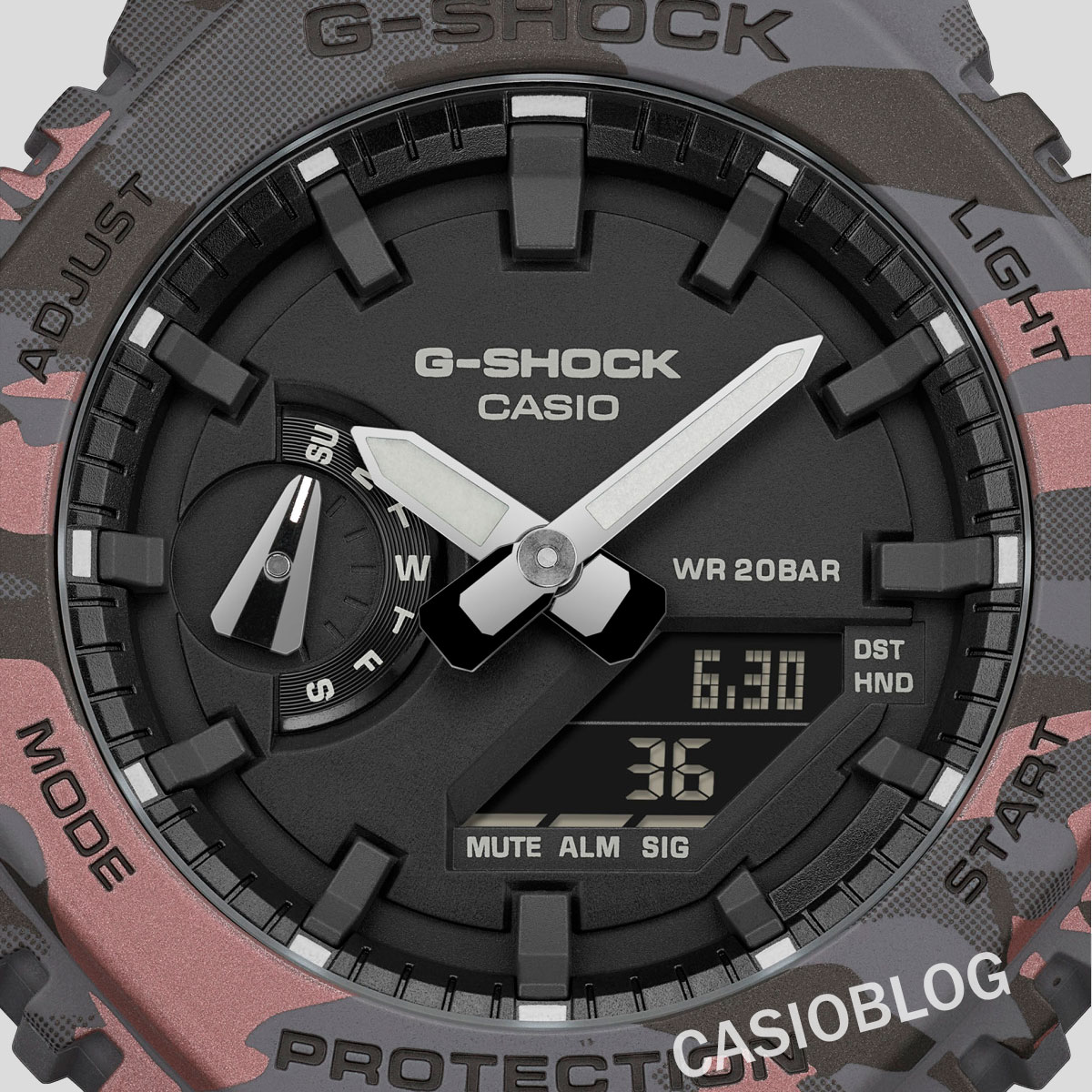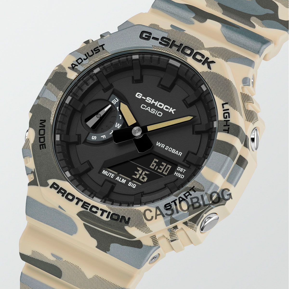 Como os senhores podem ver nas imagens em anexo, a Casio está se inclinando fortemente para a estética tática, com ambos os modelos apresentando visores invertidos (negativos), combinados com faixas e molduras decoradas com padrões de camuflagem militar. O GA-2100CM-8A tem uma camuflagem cinza-escuro, enquanto o GA-2100CM-5A opta por uma camuflagem bege e areia inspirada no deserto. De acordo com o Casioblog, os padrões pontilhados que aparecem ao lado das listras de camuflagem são aplicados usando tecnologia de pintura a laser para criar um efeito 3D.