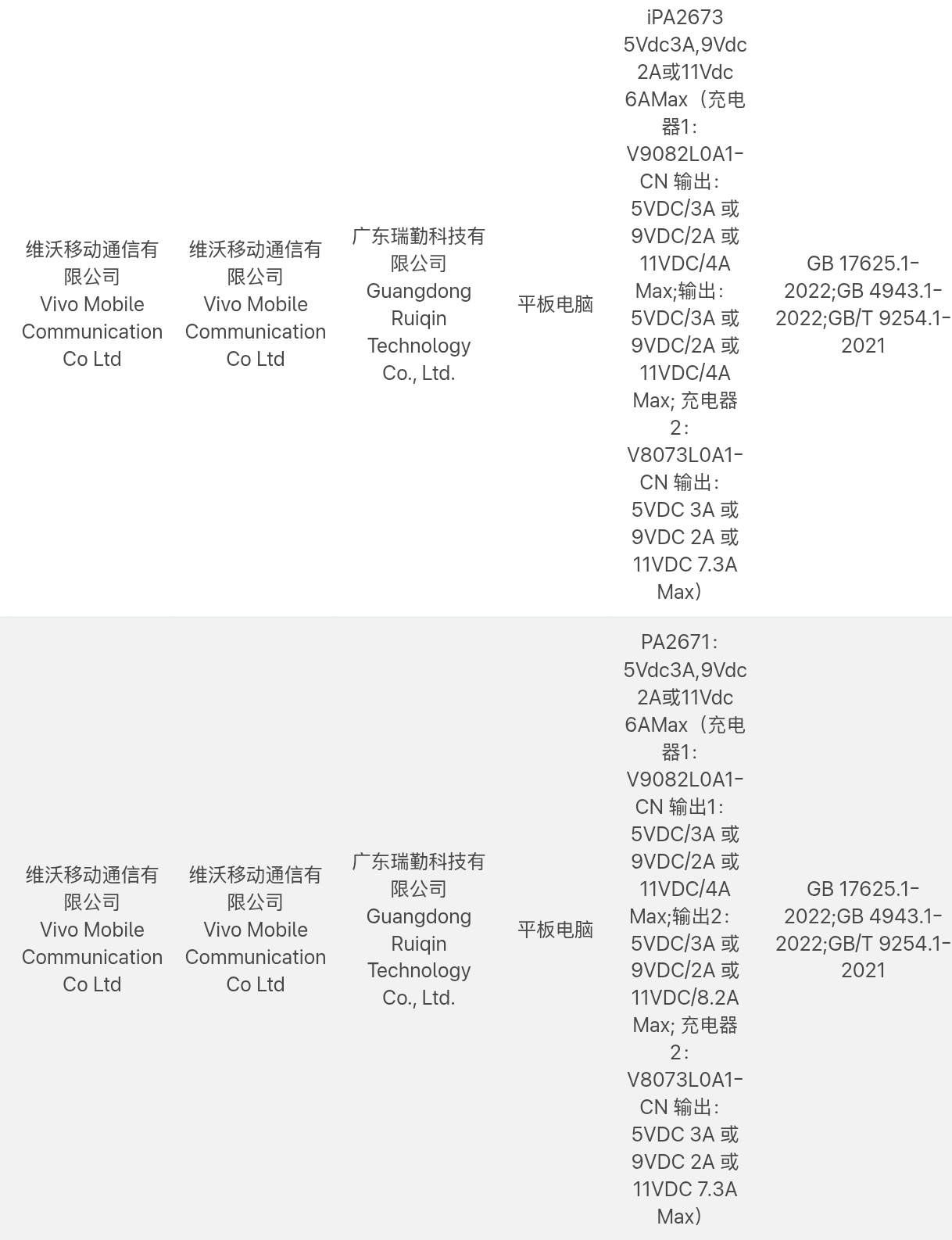 Especificamente, a empresa está desenvolvendo o iPA2673 e o PA2671, como mostra a captura de tela abaixo. Com base nos dados fornecidos pelo CCC, ambos os tablets suportam pouco mais de 80 W de carregamento com fio a 7,3 A/11 V. Com base apenas nessa potência de carregamento, a Digital Chat Station deduziu que iPA2673 e PA2671 são os números de modelo do iQOO Pad6 Pro e do Vivo Pad6 Pro.