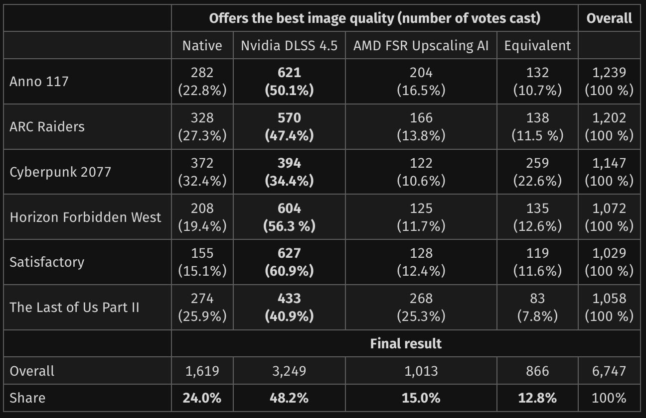 Vários jogos foram incluídos no teste, incluindo, mas não se limitando a Anno 117, ARC Raider, Cyberpunk 2077 e Last of Us Part II. No final das contas, um total de 1.619 ou 24% dos participantes preferiu a qualidade nativa, cerca de 1.013 ou 15% preferiu o FSR 4 da AMD, enquanto a grande maioria preferiu o DLSS 4.5 da Nvidia, com cerca de 3.249 ou 48,2% dos participantes.