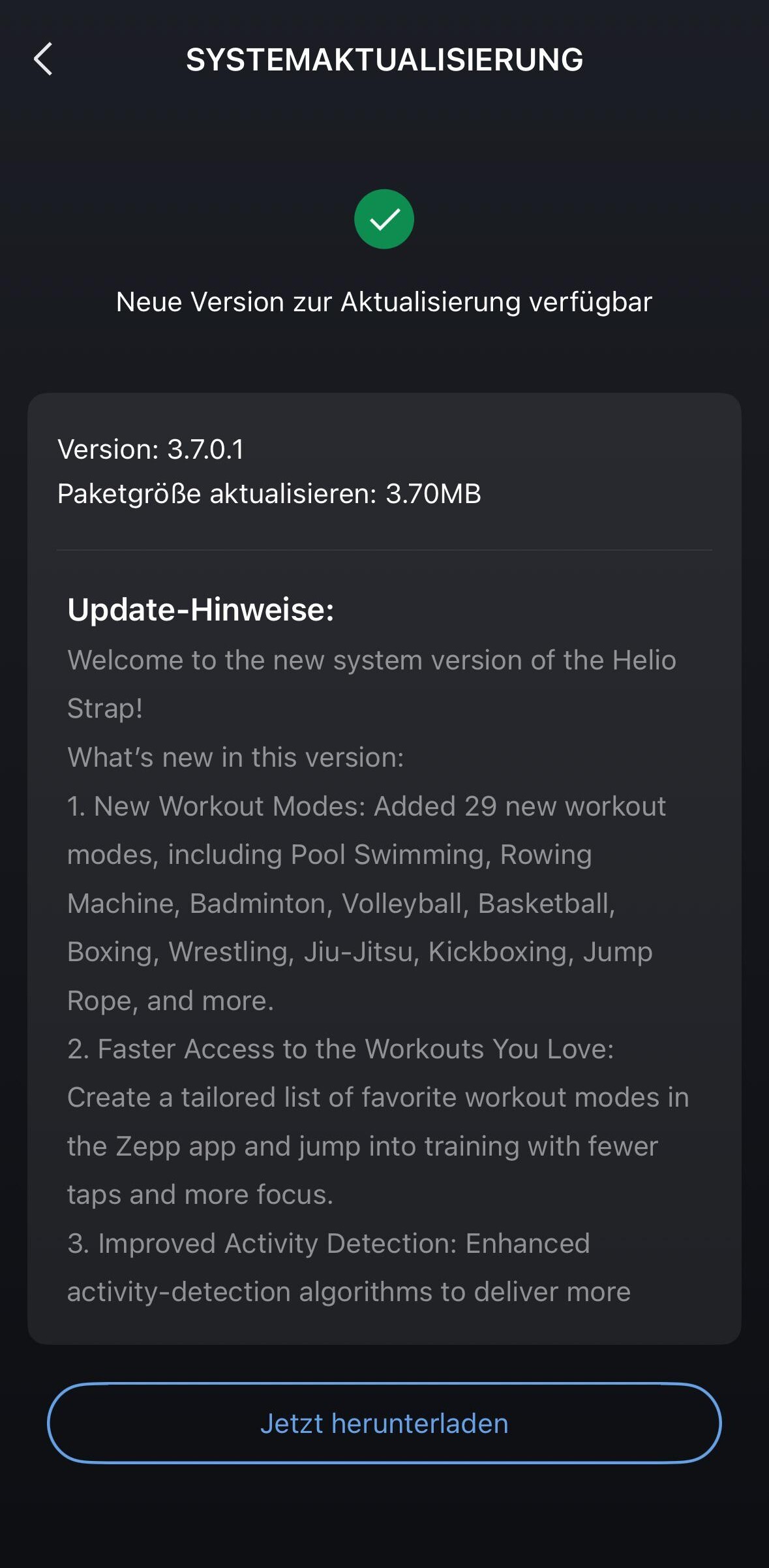 A versão 3.7.01 do software foi relatada no Reddit como sendo um arquivo de 3,70 MB. Ela traz uma série de novos modos de exercício para o Helio Strap. As 29 novas opções incluem natação em piscina, máquina de remo, badminton, vôlei, basquete, boxe, luta livre, jiu-jítsu, kickboxing e pular corda. A lista completa das novas atividades ainda não foi revelada. No entanto, parece que o golfe não é um desses modos.