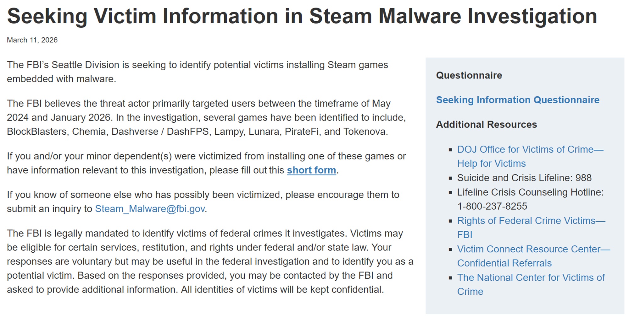 Depois de uma série de jogos Steam infectados por malware infectados por malware surgiram nos últimos anos, o FBI tomou conhecimento. Em seu site https://www.fbi.gov/how-we-can-help-you/victim-services/seeking-victim-information/seeking-victim-information-in-steam-malware-investigationele lista uma série de títulos afetados e pede às vítimas que enviem um formulário com mais informações. A Valve também verificou que a mensagem é legítima e sugere que os jogadores ajudem na investigação.