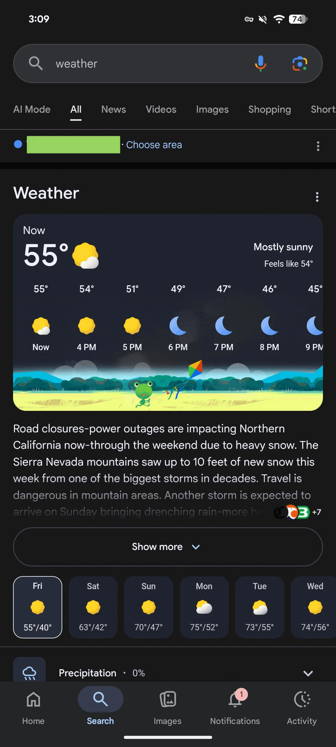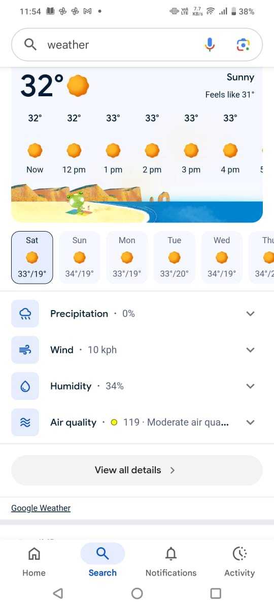 Tocar no atalho Weather na tela inicial agora leva os usuários a uma página de resultados meteorológicos da Pesquisa Google, que exibe dados de previsão com um cartão de fundo Froggy familiar, completo com um resumo meteorológico de IA, carrossel de previsão padrão de 10 dias e menus suspensos para qualidade do ar, umidade, vento e precipitação.