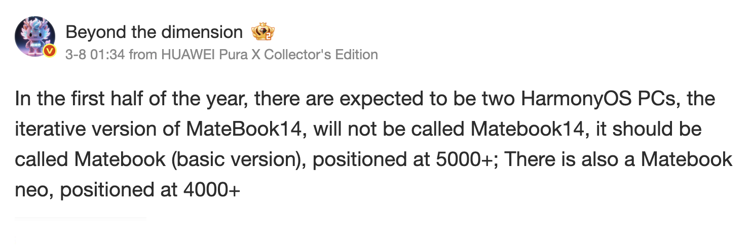 Segundo informações, a Huawei planeja oferecer uma alternativa direta chamada MateBook Neo. Mencionado pela primeira vez pela Digital Chat Station em janeiro, o MateBook Neo pode aparecer junto com um MateBook 14 atualizado. No entanto, ainda não se sabe exatamente quando. Ainda assim, a Hyperdimensional Realm espera que a Huawei ofereça o MateBook Neo por cerca de CNY 4.000 (~$ 575), com um preço inicial cerca de CNY 1.000 (~$ 145) mais barato do que o próximo MateBook 14.