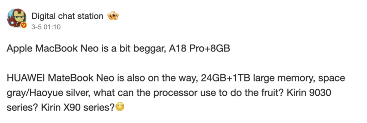 Enquanto isso, a Digital Chat Station informa que o MateBook Neo será equipado com o mesmo chipset Kirin 9030 Pro oferecido no Mate X7, Mate 80 Pro Max, Mate 80 RS Ultimate e algumas versões do Mate 80 Pro. Um chipset de 5 nm, o Kirin 9030 Pro apresenta 9 núcleos de CPU, 14 threads e uma GPU Maleoon 935.